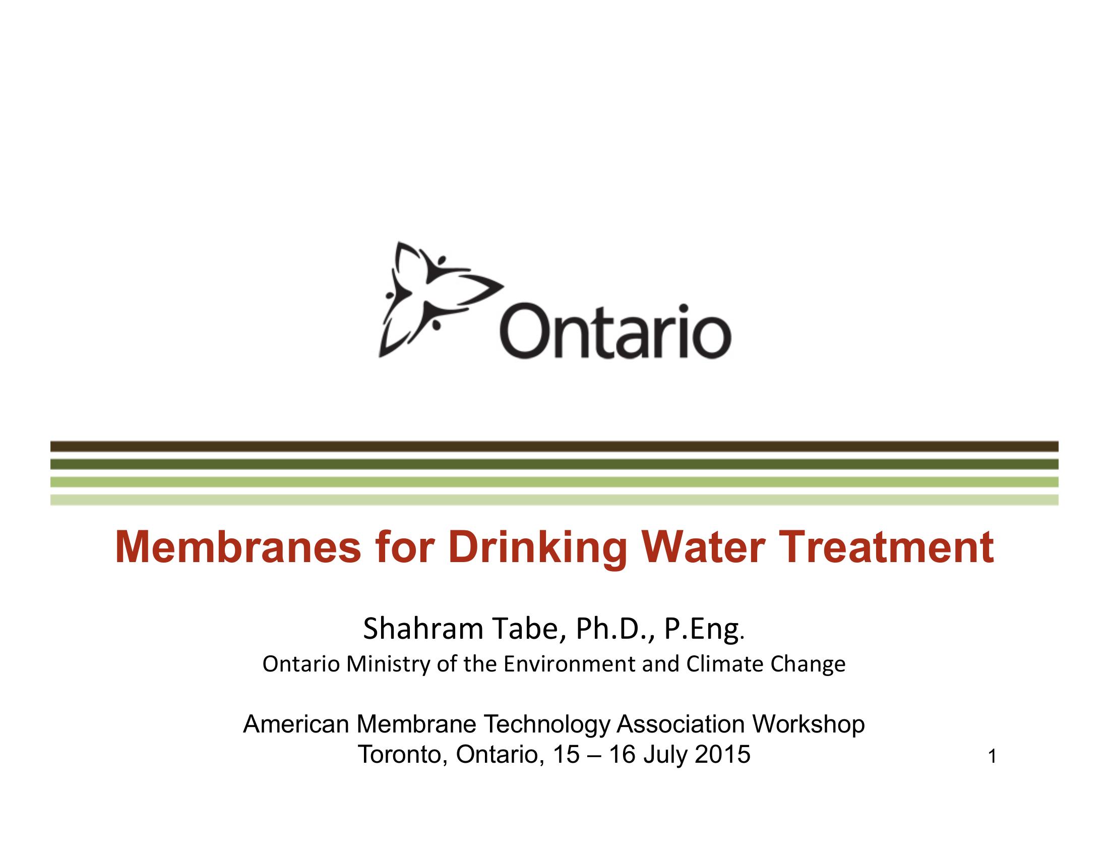 The applications of membrane processes for treatment of drinking water have increased exponentially during the past few decades. Reliable performance, ease of operation, and no need for chemicals are among the characteristics that has attracted attention from the industry and the end users. In parallel to this expansion, new regulations and guidelines were developed and documented by the regulatory bodies. This presentation will provide an overview of the regulations and guidelines in effect in Ontario overseeing the applications of membranes for water treatment in Ontario.