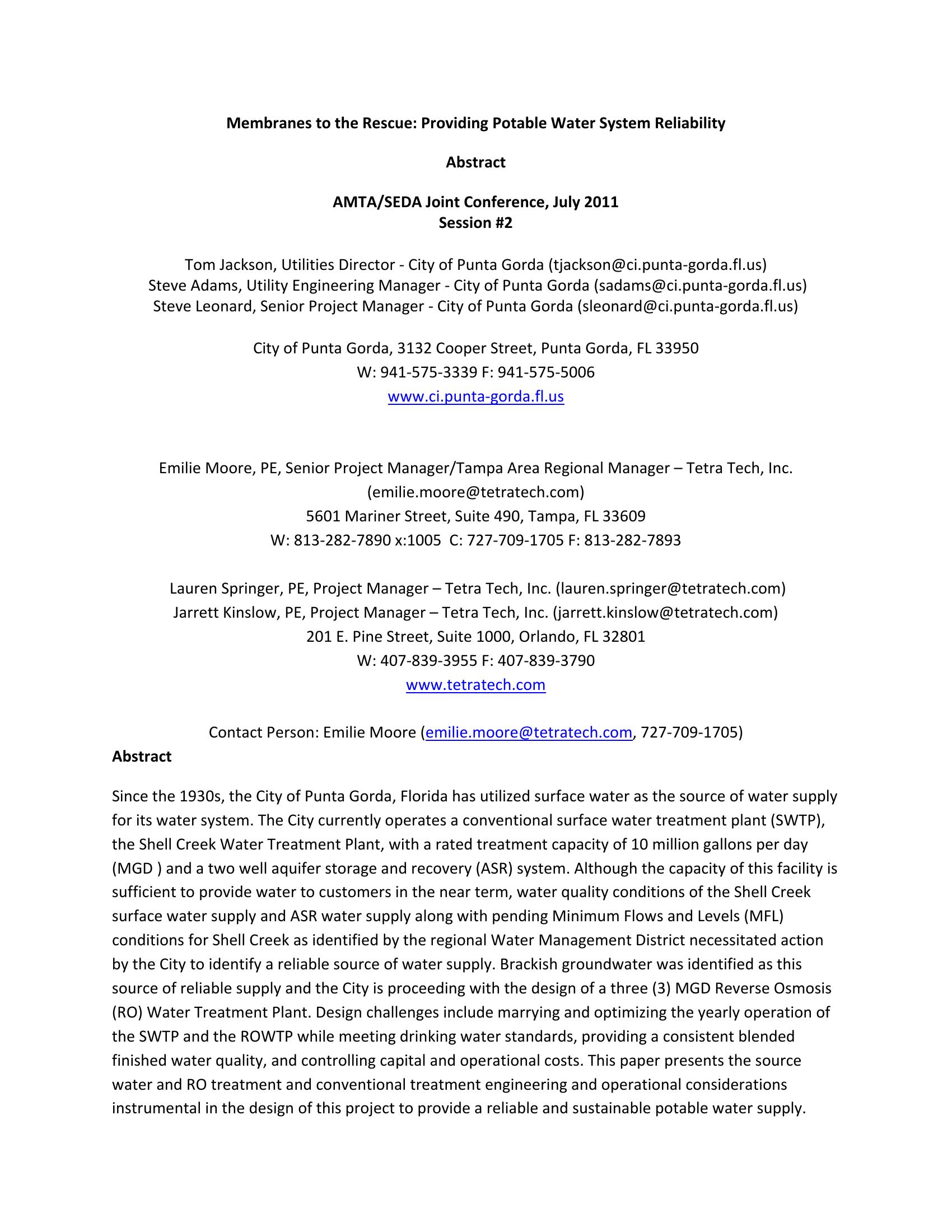 This paper presents the source water and RO treatment and conventional treatment engineering and operational considerations instrumental in the design of the Punta Gorda Florida project to provide a reliable and sustainable potable water supply
