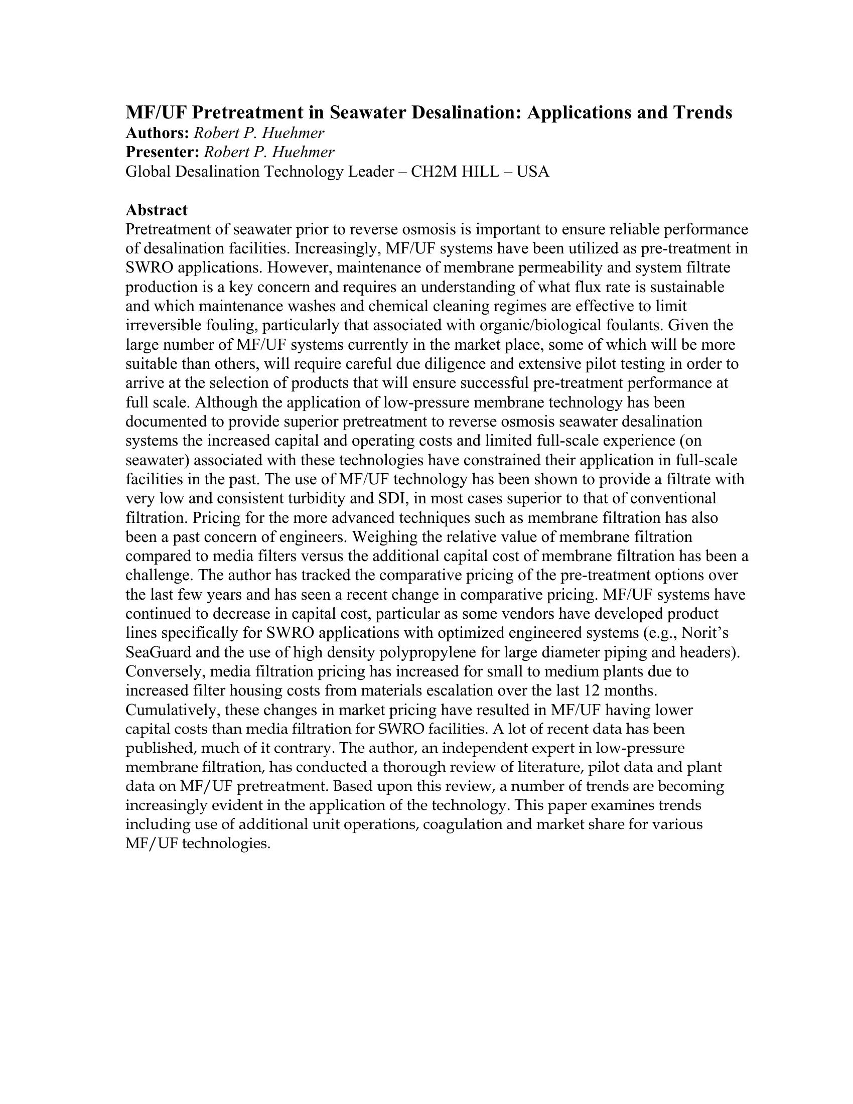 This talk summarizes the rapid growth of the use of MF and UF as pretreatment for seawater desalination. Cost, filtrate quality, operations, membrane materials all contribute to the increase in MF/UF for RO pretreatment on a world wide basis.