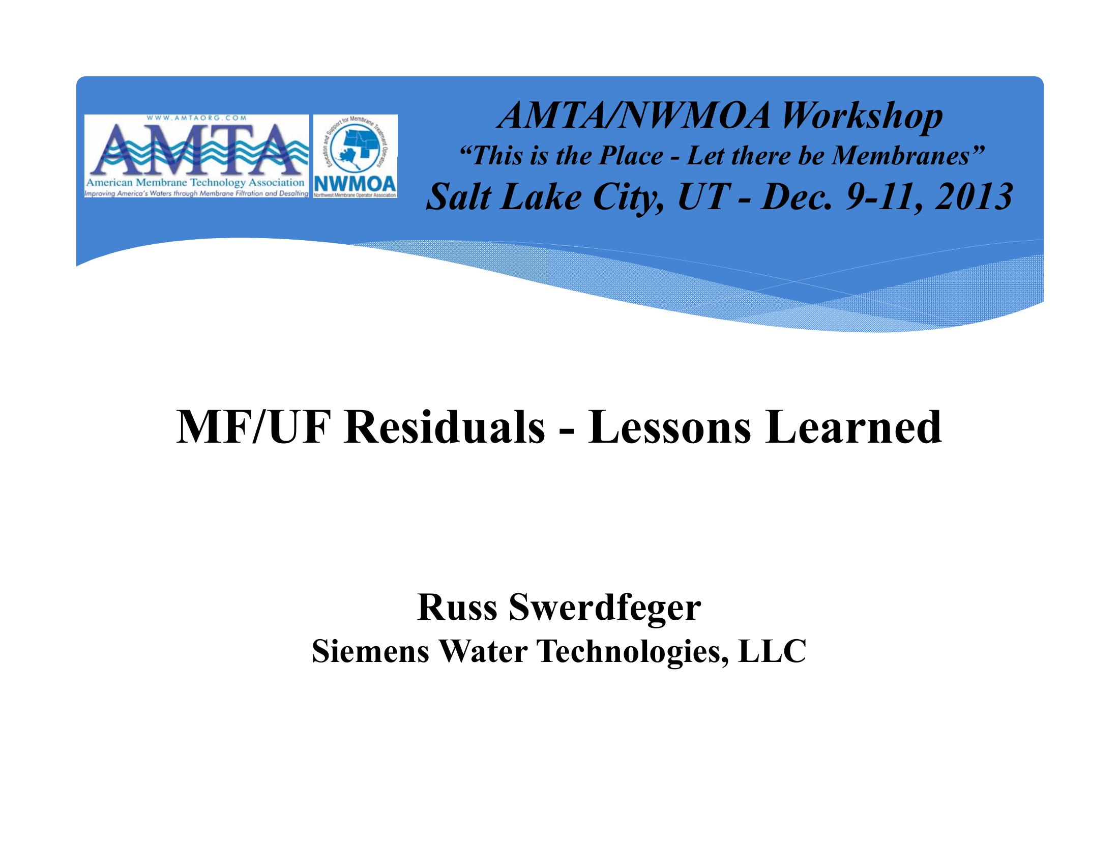 This presentation discusses the types of microfiltration (MF) and ultrafiltration (UF) residual streams, residual handling approaches, MF/UF system design considerations, and a case study from the Bajamont Way Water Treatment Plant in Carmichael, California. The discussion includes water chemistry concerns related to chemical cleaning solutions and mass balance considerations for designing solids handling processes. Solids handling processes discussed include clarification, sedimentation and secondary membrane systems.