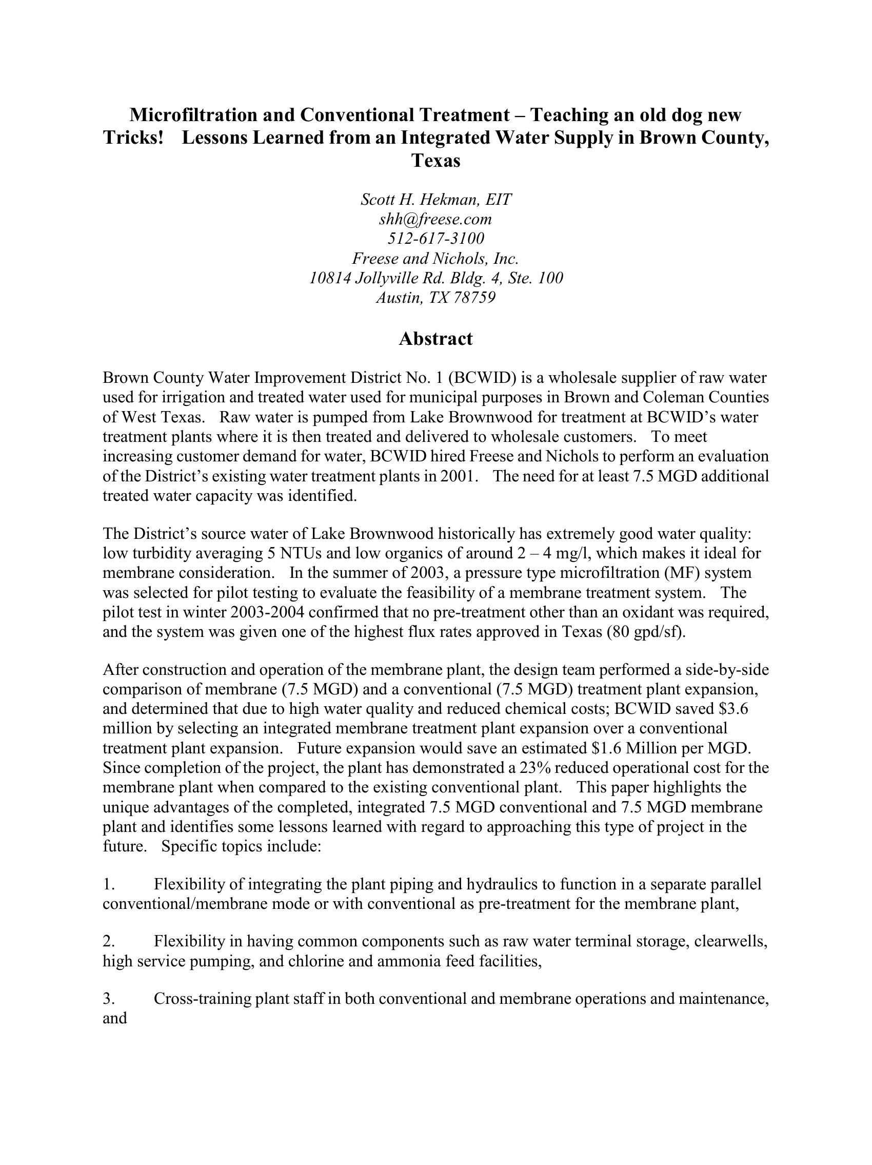 Brown County Water Improvement District No. 1 (BCWID) is a wholesale supplier of raw water from Lake Brownwood used for irrigation and treated water used for municipal purposes. To meet increasing demand, an additional 7.5 MGD capacity was identified in 2001. In the summer of 2003, a microfiltration (MF) system was selected for pilot testing to evaluate the feasibility of a membrane treatment system. The pilot test in winter 2003-2004 confirmed that no pre-treatment other than an oxidant was required, and the system was given the highest flux rates approved in Texas (80 gpd/sf). After construction, the design team performed a side-by-side comparison of membrane (7.5 MGD) and a conventional (7.5 MGD) treatment plant expansion, and determined that due to high water quality and reduced chemical costs; BCWID could save $3.6 MM by selecting an integrated membrane treatment plant expansion. The plant has demonstrated a 23% reduced operational cost for the membrane plant since completion when compared to the existing conventional plant.
