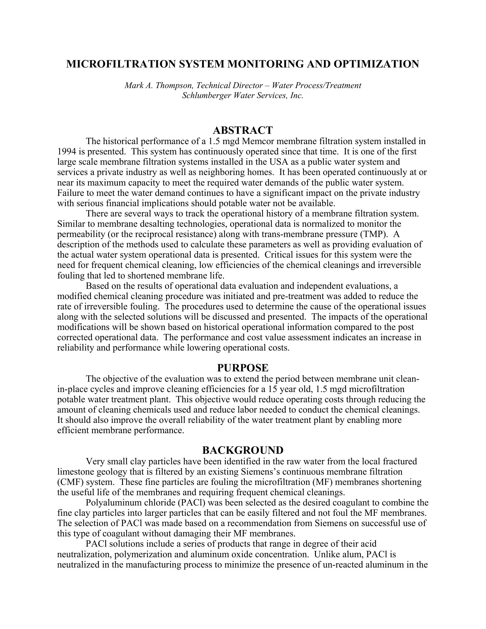 The historical performance of a 1.5 mgd Memcor membrane filtration system installed in 1994 is presented. This system has continuously operated since that time. It is one of the first large scale membrane filtration systems installed in the USA as a public water system and services a private industry as well as neighboring homes. There are several ways to track the operational history of a membrane filtration system. Similar to membrane desalting technologies, operational data is normalized to monitor the permeability (or the reciprocal resistance) along with trans-membrane pressure (TMP). A description of the methods used to calculate these parameters as well as providing evaluation of the actual water system operational data is presented. Critical issues for this system were the need for frequent chemical cleaning, low efficiencies of the chemical cleanings and irreversible fouling that led to shortened membrane life. Based on the results of operational data evaluation and independent evaluations, a modified chemical cleaning procedure was initiated and pre-treatment was added to reduce the rate of irreversible fouling. Very small clay particles have been identified in the raw water from the local fractured limestone geology that is filtered by an existing Siemens’s continuous membrane filtration (CMF) system. These fine particles are fouling the microfiltration (MF) membranes shortening the useful life of the membranes and requiring frequent chemical cleanings. Polyaluminum chloride (PACl) was been selected as the desired coagulant to combine the fine clay particles into larger particles that can be easily filtered and not foul the MF membranes. Samples of five (5) different PACl solutions were tested. The value of using the PACl can be determined by both quantitative and subjective assessments. Actual operational cost savings can be calculated based on the reduction of chemicals needed for cleaning the membranes. The 5 mg/L PACl feed into the raw water line occurs just prior to entry into the raw water reservoir and shows a tremendous advantage for operation of the membrane facility.