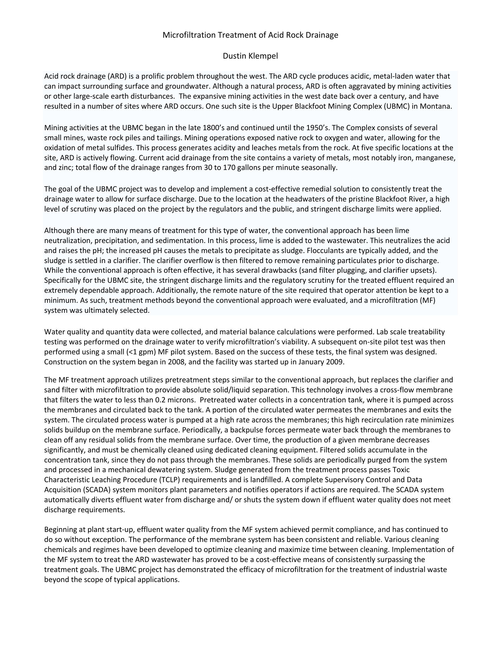 Microfiltration Treatment of Acid Rock Drainage
