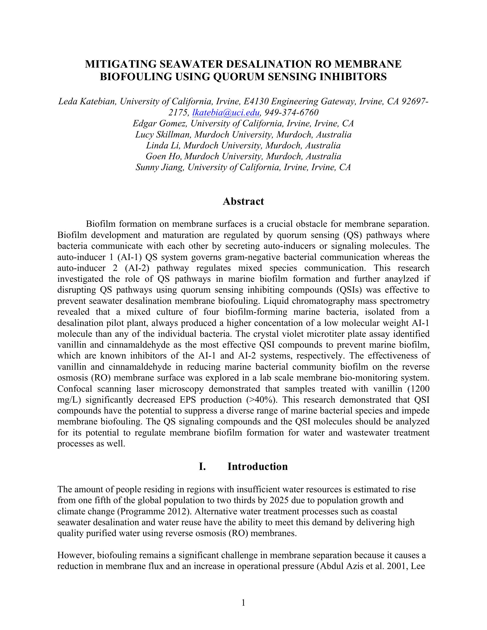 | Keywords | Fouling, Seawater, Reverse Osmosis, Quorum Sensing Inhibitors |