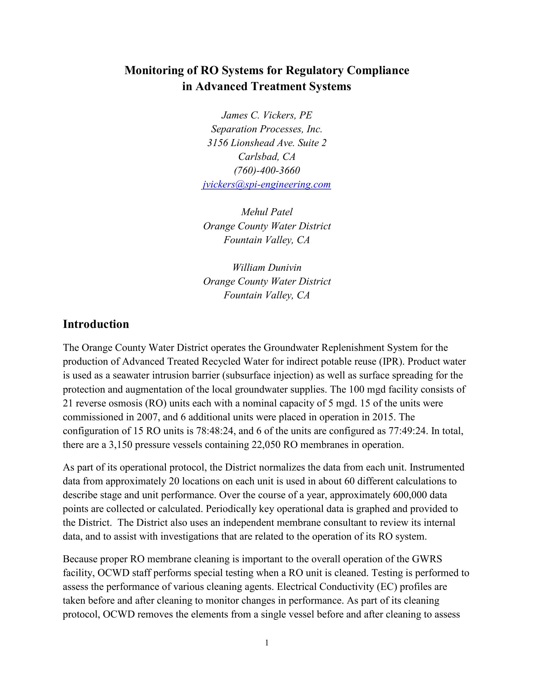 The purpose of the paper is to discuss water quality monitoring practices that are associated with the operation of RO systems at Advanced Treated (aka Recycled) Water Facilities. Conventional regulatory approaches with regard to the use of surrogate indicators of operational performance (e.g., permeate conductivity, TOC) are affected by variations in water quality and temperature that increase the concentration of constituents due to diffusion. OCWD uses Normalized Percent Removal to monitor systems for operational purposes. The integrity of the system is a separate issue, and OCWD has established a protocol of conductivity profiling to identify individual pressure vessels within the unit that have integrity concerns.