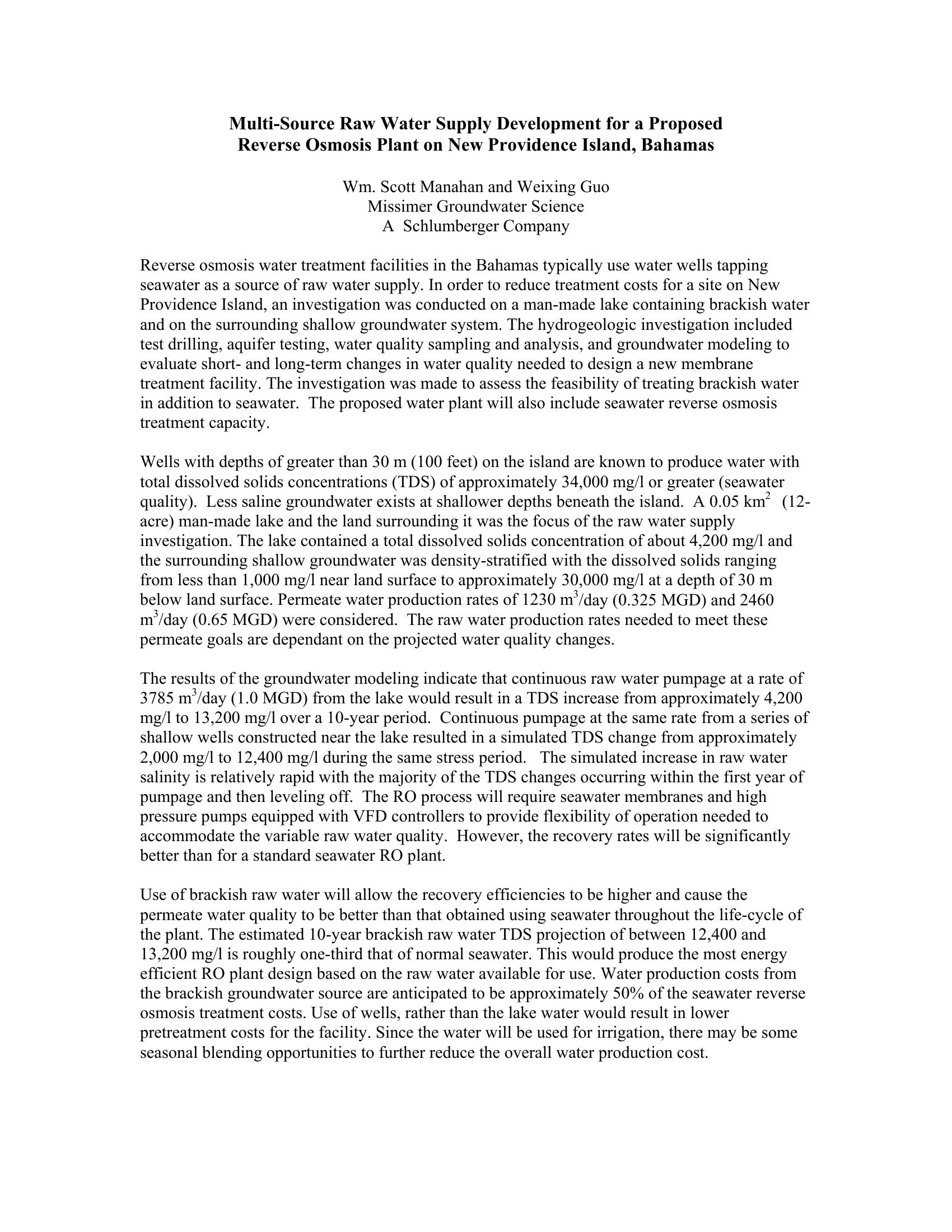 Multi-Source Raw Water Supply Development for a Proposed Reverse Osmosis Plant on New Providence Island, Bahamas