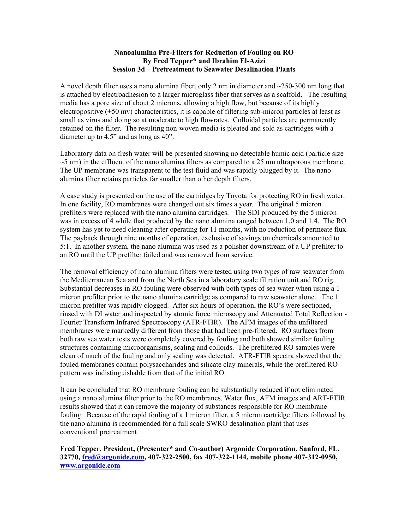 Nanoalumina Pre-filters for Reduction of Fouling on RO