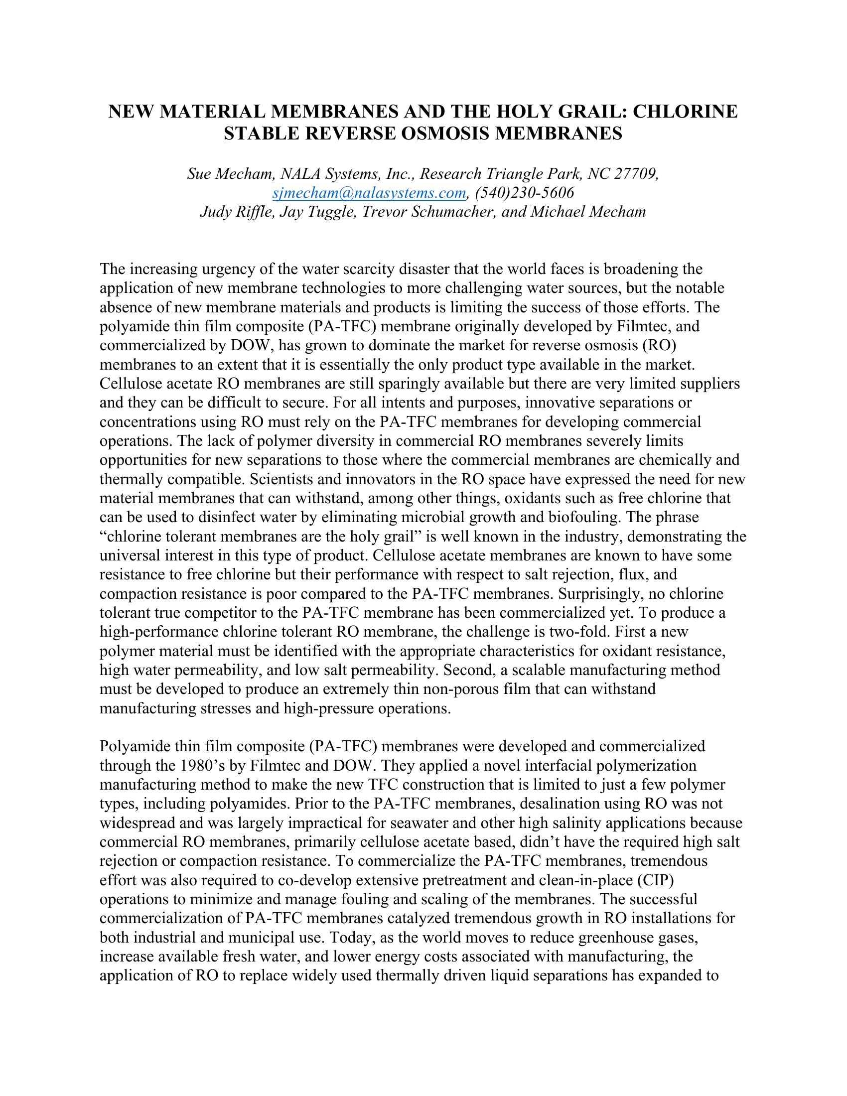 The increasing urgency of the water scarcity disaster that the world faces is broadening the application of new membrane technologies to more challenging water sources, but the notable absence of new membrane materials and products is limiting the success of those efforts. The polyamide thin film composite (PA-TFC) membrane originally developed by Filmtec, and commercialized by DOW, has grown to dominate the market for reverse osmosis (RO) membranes to an extent that it is essentially the only product type available in the market. Cellulose acetate RO membranes are still sparingly available but there are very limited suppliers and they can be difficult to secure. For all intents and purposes, innovative separations or concentrations using RO must rely on the PA-TFC membranes for developing commercial operations. The lack of polymer diversity in commercial RO membranes severely limits opportunities for new separations to those where the commercial membranes are chemically and thermally compatible. Scientists and innovators in the RO space have expressed the need for new material membranes that can withstand, among other things, oxidants such as free chlorine that can be used to disinfect water by eliminating microbial growth and biofouling. The phrase ìchlorine tolerant membranes are the holy grailî is well known in the industry, demonstrating the universal interest in this type of product. Cellulose acetate membranes are known to have some resistance to free chlorine but their performance with respect to salt rejection, flux, and compaction resistance is poor compared to the PA-TFC membranes. Surprisingly, no chlorine tolerant true competitor to the PA-TFC membrane has been commercialized yet. To produce a high-performance chlorine tolerant RO membrane, the challenge is two-fold. First a new polymer material must be identified with the appropriate characteristics for oxidant resistance, high water permeability, and low salt permeability. Second, a scalable manufacturing method must be developed to produce an extremely thin non-porous film that can withstand manufacturing stresses and high-pressure operations.