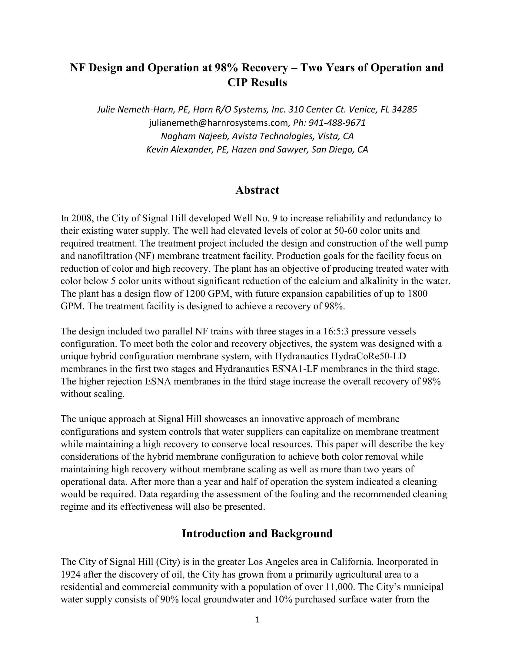 The City of Signal Hill’s nanofiltration plant was designed and built primarily for color removal and some total dissolved solids reduction. The plant was successfully built and started up over two years ago. After more than one year of operation the plant was cleaned for the first time. This paper will present information on the plant design and operation, and provide the results from the innovative and effective cleaning regime that was implemented.