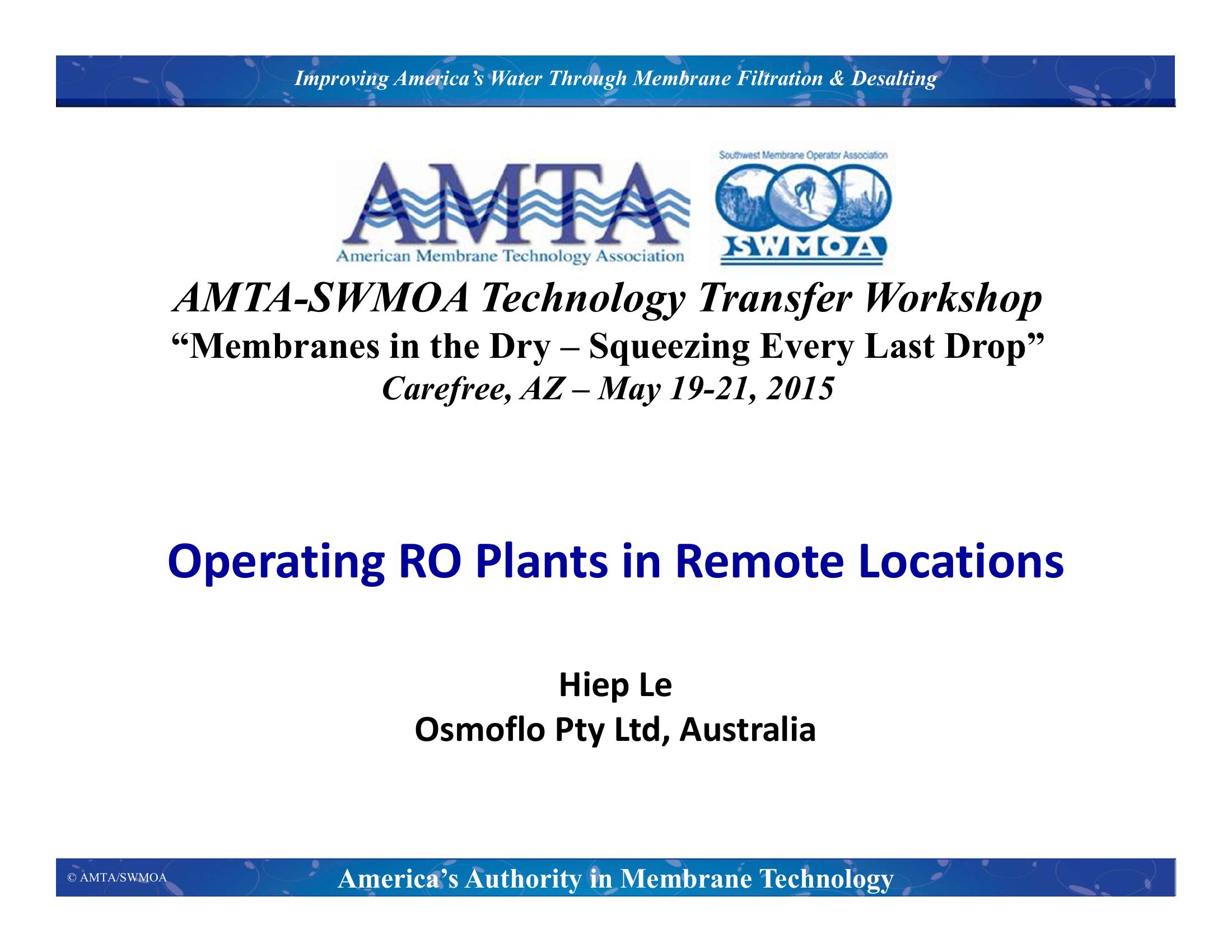 Osmoflo remotely operates more than 120 plants that are located across Australia, Hong Kong, New Caledonia and Chile. More than 50% of these are located in remote locations, having significant distances from a major city and remotely operating the RO plants is a challenge. To overcome the challenges innovation has been applied in man, machine, method, material and measurement areas. Three case studies for remotely operated RO plants are presented. The first is a plant at Gingko mineral sands mine 1160km from Sydney. This is a build, own and operated plant and treats challenging hypersaline groundwater to produce 2.1ML/d of permeate for process and potable water. It consists of simple multimedia filters and SWRO. The second plant is at Mineral El Tosoro in the Atacama desert, Chile. This plant treats groundwater (stored in ponds) with iron, colloidal suspended solids and high silica. The plant originally had coagulation with multimedia filters as pretreatment but was upgraded to UF pretreatment when Osmoflo took over operations in 2013. It has two pass RO to supply potable water (through first pass RO permeate) and low chloride process water. The third plant is at Moomba, 770km from Adelaide. This plant has been in operations for >10yrs and treats groundwater with some hydrocarbons and high temperature. It consists of cooling towers, multimedia filters, first pass RO with carbon filters for potable water and second pass RO for demineralised water. The client has forecasted higher potable water demand and Osmoflo has proposed the Brine Squeezer process to recover more water from the first pass RO concentrate. The Brine Squeezer operates very differently from conventional RO to achieve ultra-high, overall recoveries and can easily be operated remotely. These case studies demonstrate that remote RO operation yields high availability and deliver lower operating and maintenance costs for many remote sites. This is possible with considerations in product lifecycle areas.