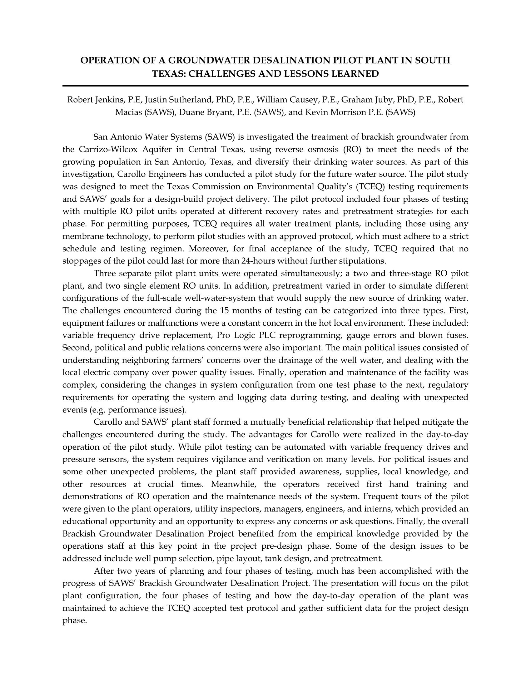 The San Antonio Water System (SAWS) is investigating the treatment of brackish water desalination to augment its water portfolio. Because off the stringent pilot testing requirements required in Texas a thorough pilot test must be conducted with no shutdowns for more than 24 hours. Because issues are bound to come up in pilot testing a list of lessons learned was developed. 1. have enough replacement equipment that will not be available readily in local stores. 2.Design the system to be easily fixed. 3. make sure engineers and operators are trained to operate and repair the equipment on site.