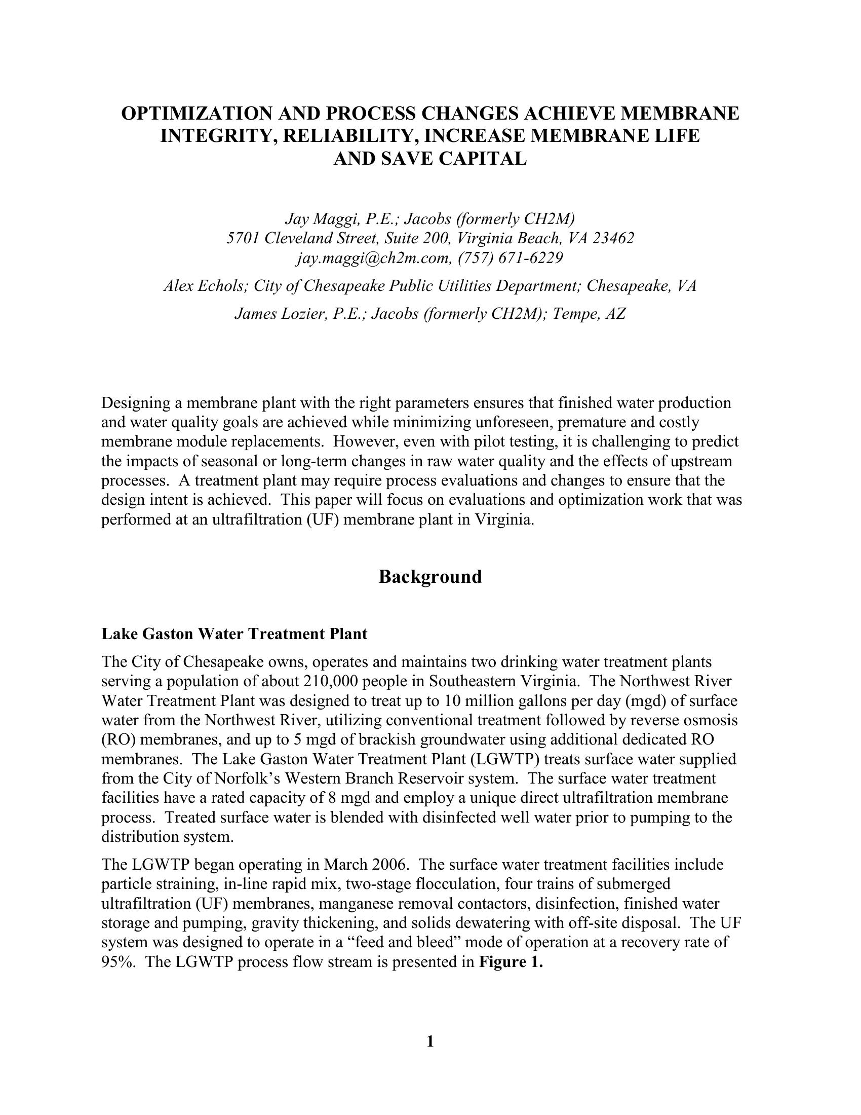Designing a membrane plant with the right parameters ensures that finished water production and water quality goals are achieved while minimizing unforeseen, premature and costly membrane module replacements. However, even with pilot testing, it is challenging to predict the impacts of seasonal or long-term changes in raw water quality and the effects of upstream processes. A treatment plant may require process evaluations and changes to ensure that the design intent is achieved. This paper will focus on evaluations and optimization work that was performed at an ultrafiltration (UF) membrane plant in Virginia.