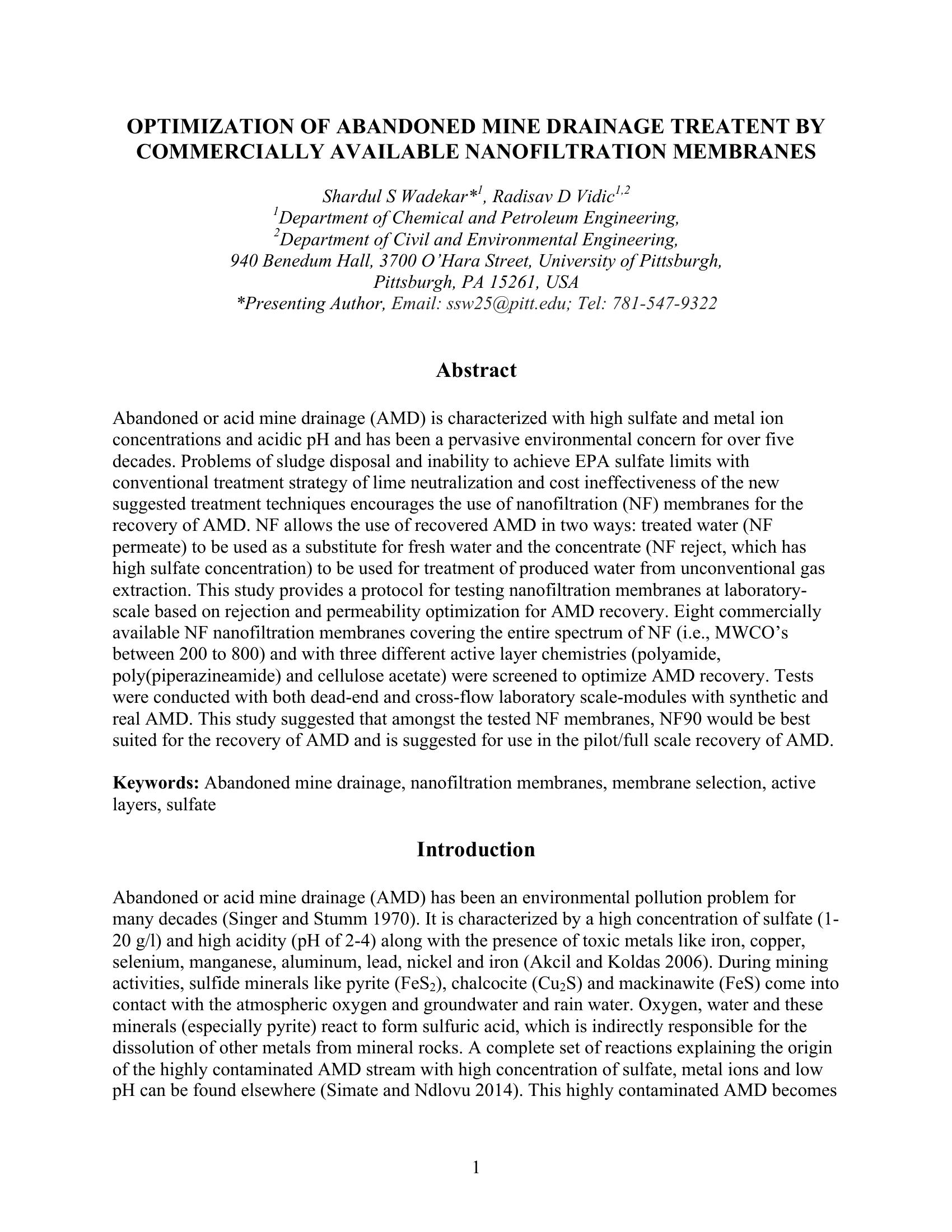 Abandoned or acid mine drainage (AMD) is characterized with high sulfate and metal ion concentrations and acidic pH and has been a pervasive environmental concern for over five decades. Problems of sludge disposal and inability to achieve EPA sulfate limits with conventional treatment strategy of lime neutralization and cost ineffectiveness of the new suggested treatment techniques encourages the use of nanofiltration (NF) membranes for the recovery of AMD. NF allows the use of recovered AMD in two ways: treated water (NF permeate) to be used as a substitute for fresh water and the concentrate (NF reject, which has high sulfate concentration) to be used for treatment of produced water from unconventional gas extraction. This study provides a protocol for testing nanofiltration membranes at laboratoryscale based on rejection and permeability optimization for AMD recovery. Eight commercially available NF nanofiltration membranes covering the entire spectrum of NF (i.e., MWCO’s between 200 to 800) and with three different active layer chemistries (polyamide, poly(piperazineamide) and cellulose acetate) were screened to optimize AMD recovery. Tests were conducted with both dead-end and cross-flow laboratory scale-modules with synthetic and real AMD. This study suggested that amongst the tested NF membranes, NF90 would be best suited for the recovery of AMD and is suggested for use in the pilot/full scale recovery of AMD.