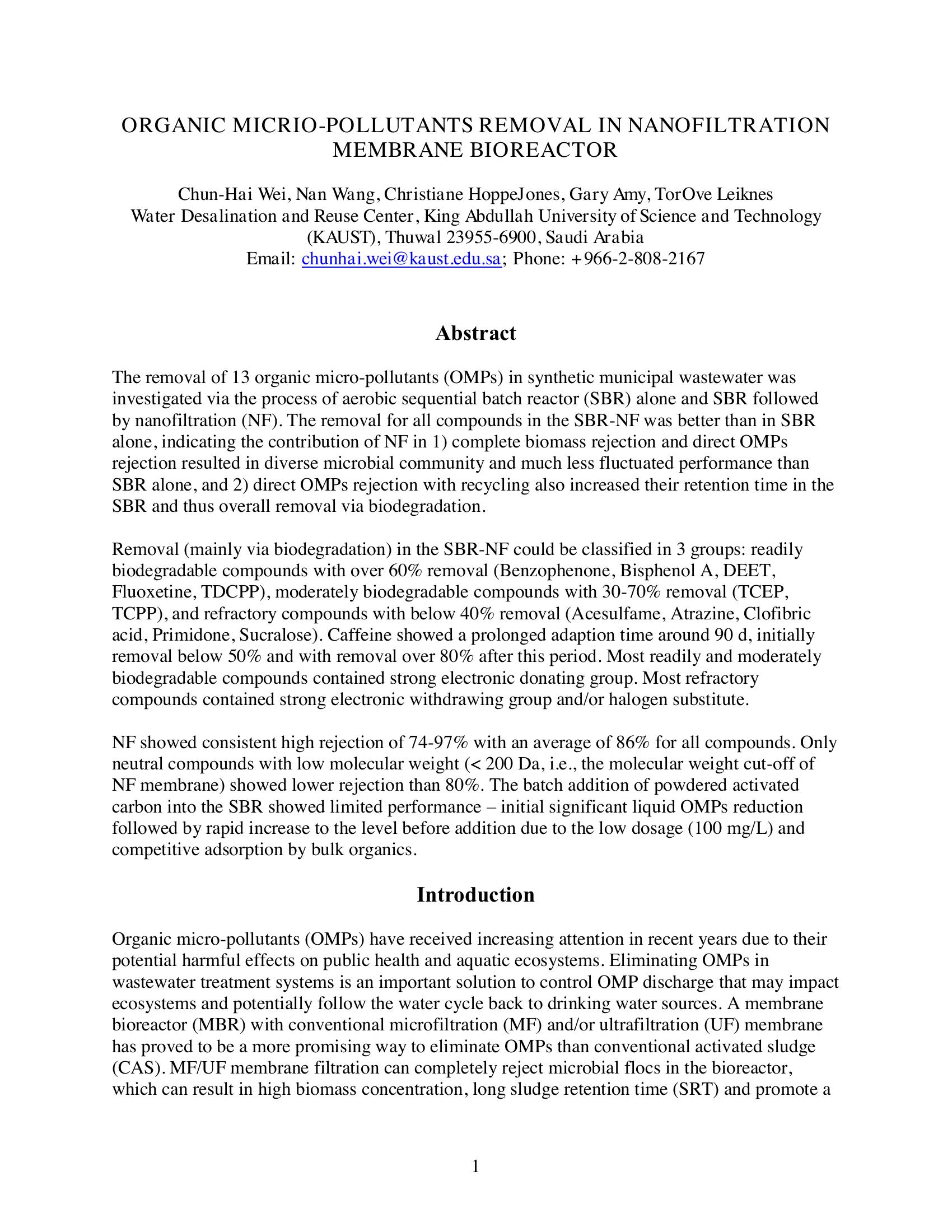 This presentation outlines the use of Nanofiltration to enhance the retention time of OMPs in a Sequential Batch Reactor (SBR) and the overall removal via biodegradation as well as through direct rejection, especially for moderately biodegradable and refractory compounds. Although better performance was achieved with SBR-NF than SBR alone, it would not an absolute barrier for OMPs discharge from WWTPs. Coupling post treatment such as adsorption and/or oxidation would be necessary to remove some of the recalcitrant compounds.