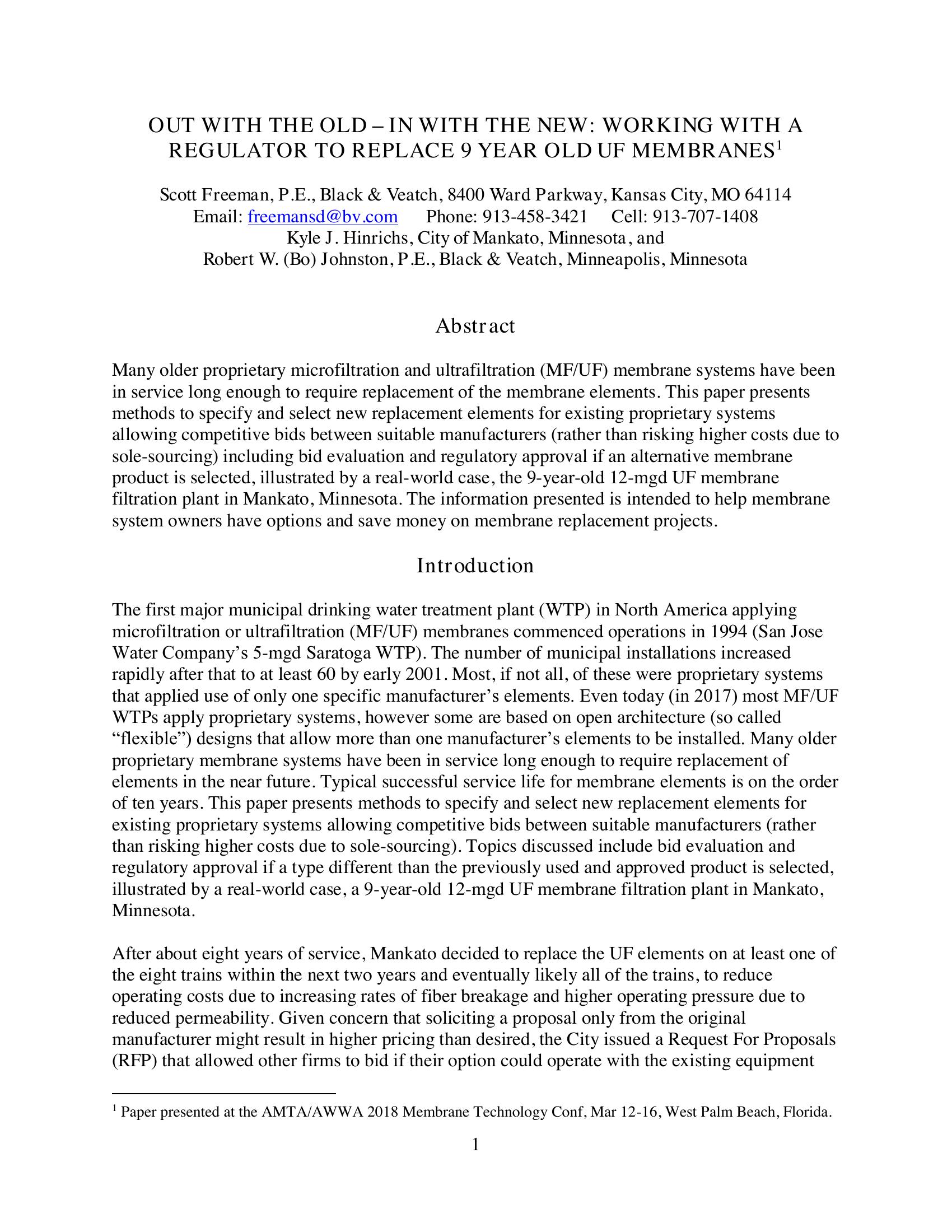 Many older proprietary microfiltration and ultrafiltration (MF/UF) membrane systems have been in service long enough to require replacement of the membrane elements. This paper presents methods to specify and select new replacement elements for existing proprietary systems allowing competitive bids between suitable manufacturers (rather than risking higher costs due to sole-sourcing) including bid evaluation and regulatory approval if an alternative membrane product is selected, illustrated by a real-world case, the 9-year-old 12-mgd UF membrane filtration plant in Mankato, Minnesota. The information presented is intended to help membrane system owners have options and save money on membrane replacement projects.