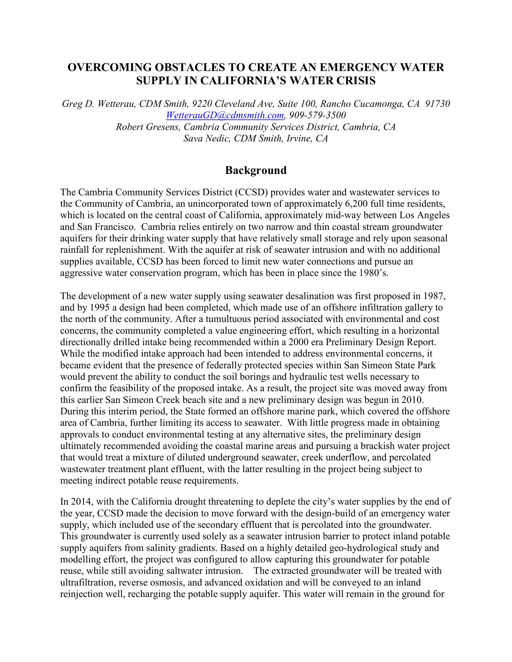 KeywordsIndirect Potable Reuse, Evaporation of RO Concentrate for Disposal, Cambria Community Service District