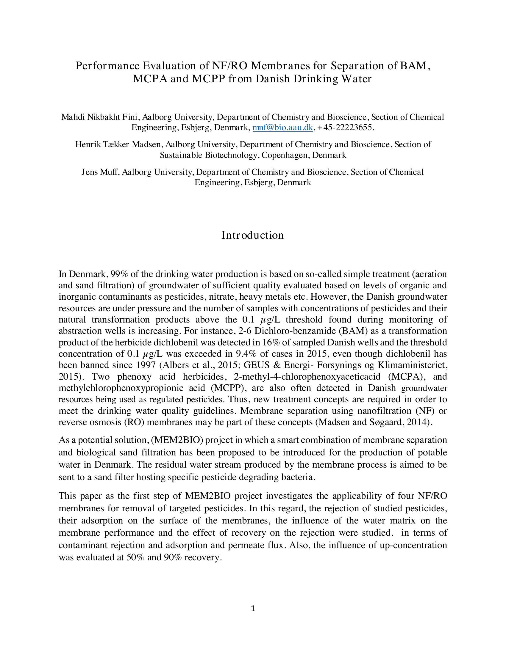 Performance Evaluation of NF/RO Membranes for Separation of BAM, MCPA and MCPP From Danish Drinking Water