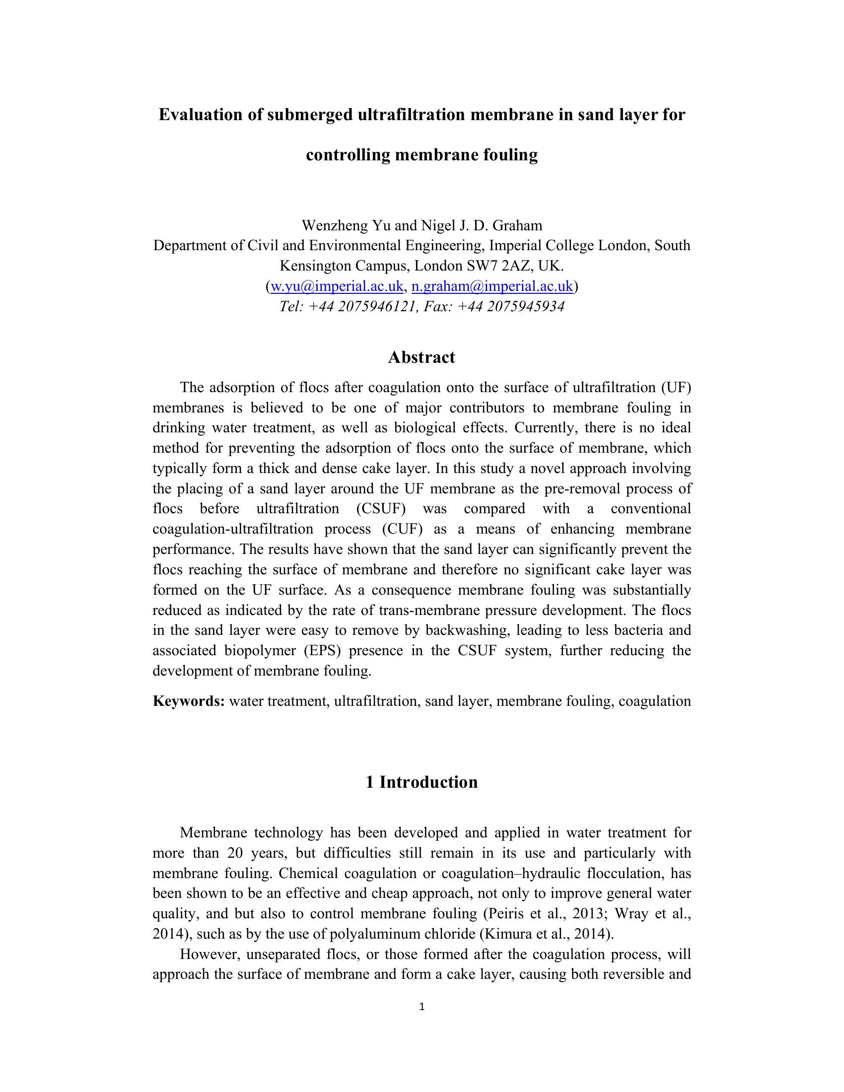 KeywordsSubmerged Ultrafiltration Membrane, Sand layer, coagulation