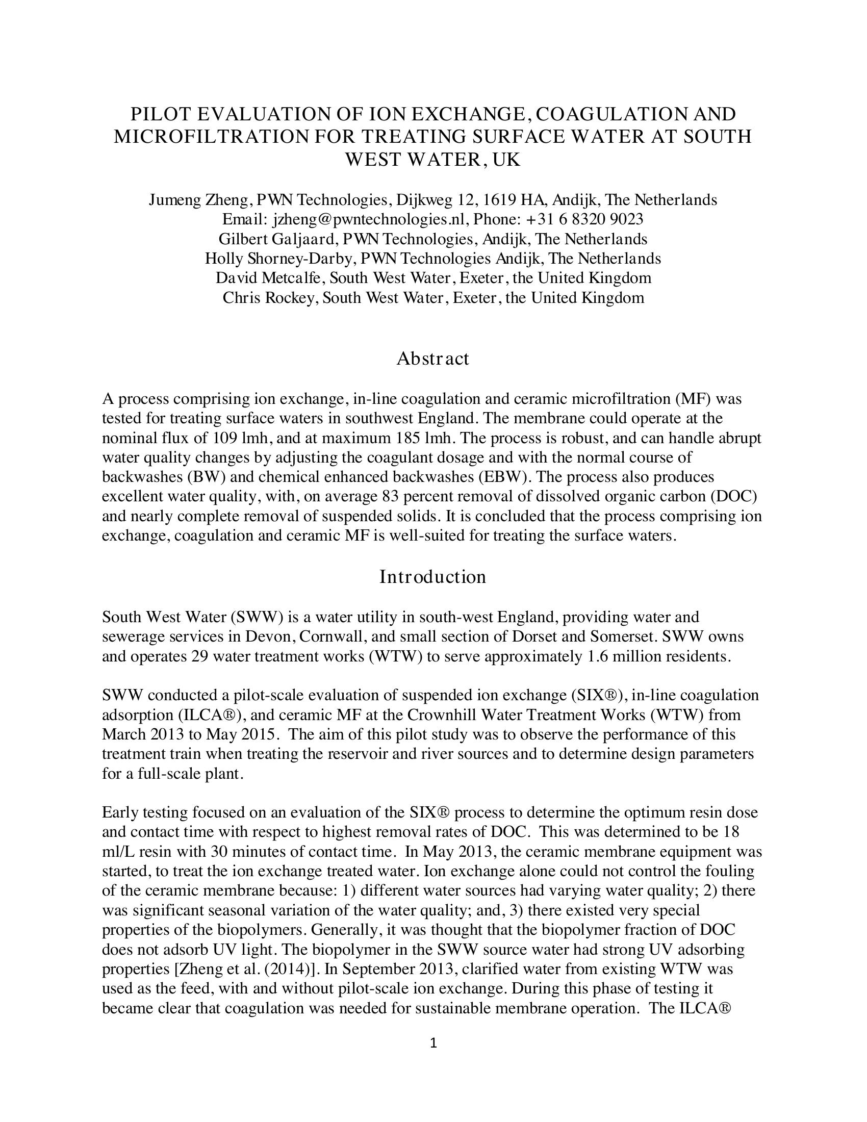 Pilot Evaluation of Ion Exchange, Coagulation and Ceramic MF for Treating Surface Water at South West Water, UK