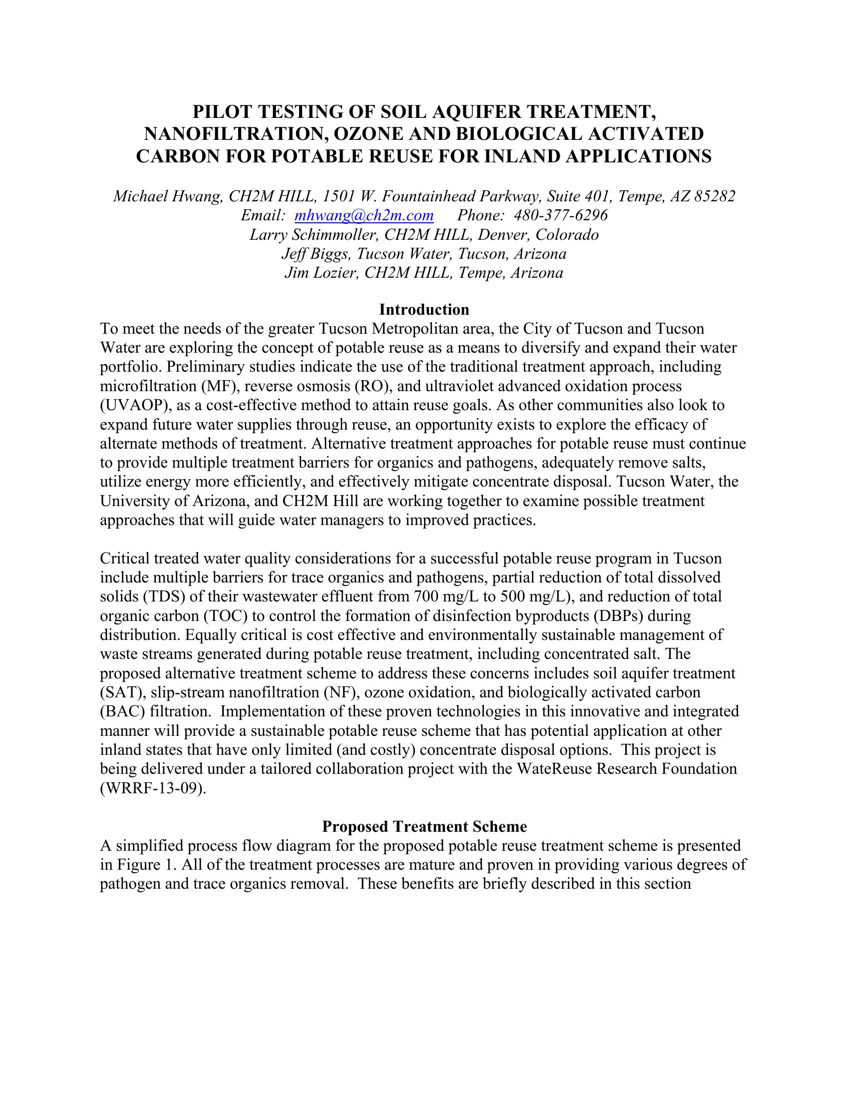 Pilot Testing of SAT, NF, O3, BAC for Potable Reuse for Inland Applications