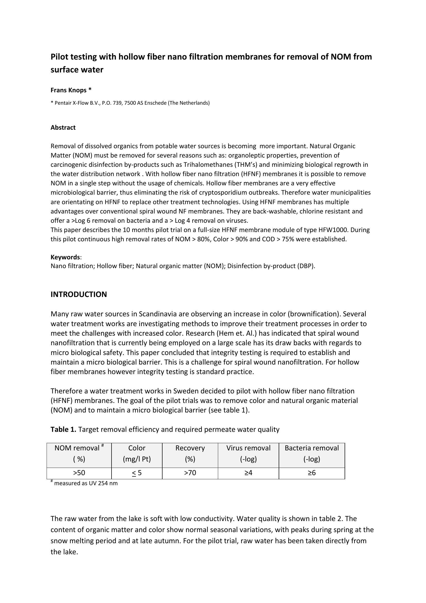 Keywordshollow fiber nanofiltration, natural organic matter, NOM, HFNF