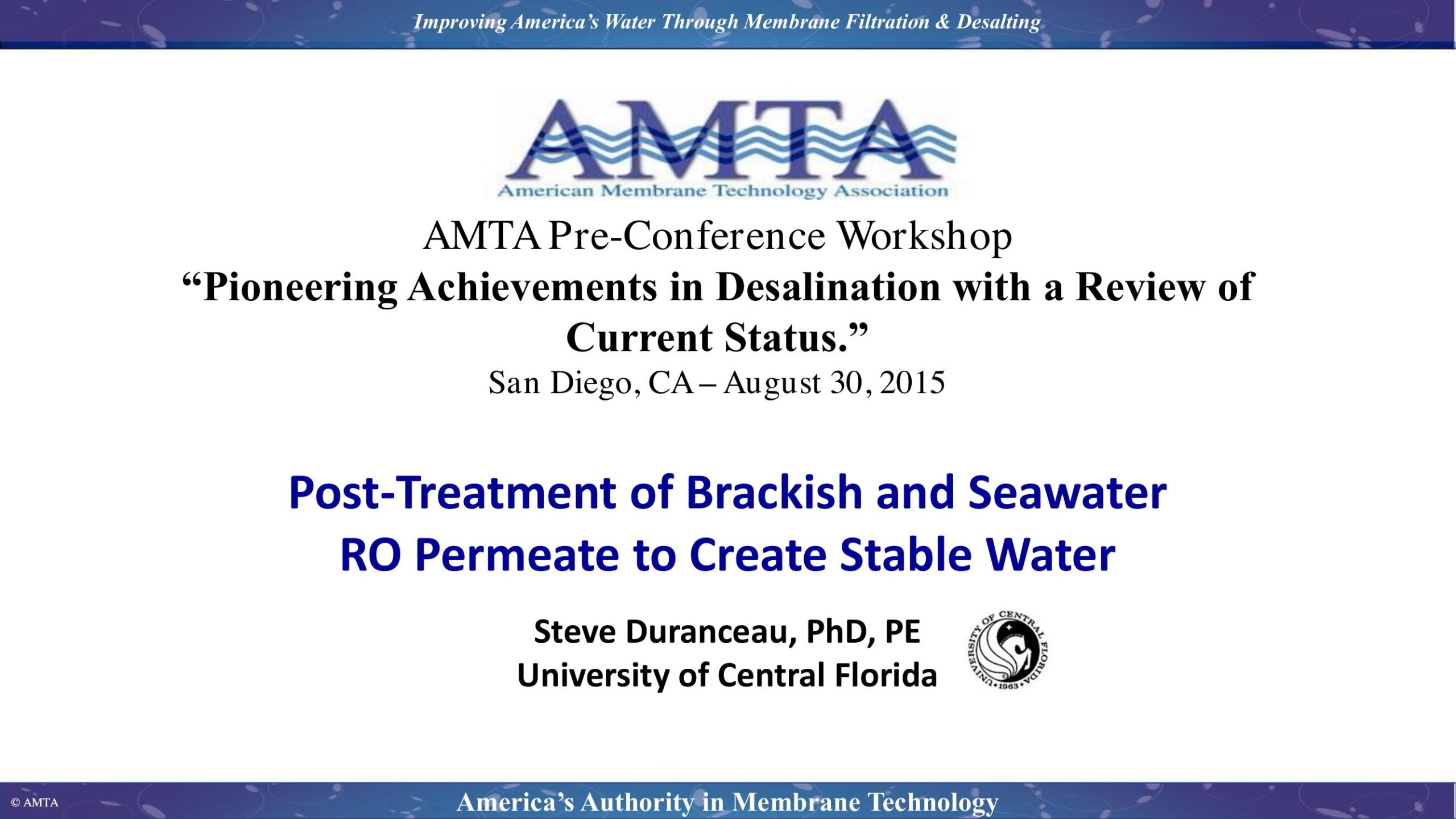 The use of synthetic membrane processes for desalination and production of drinking water has increased over the past five decades primarily in coastal areas with limited freshwater sources. Desalting techniques are primarily intended for the removal of total dissolved salts (TDS) that generally cannot be removed by conventional treatment processes. Beginning in the 1970s the water industry began to focus on commercially viable desalination applications using synthetic membranes. Today, reverse osmosis (RO), nanofiltration (NF), and electrodialysis reversal (EDR) are the most commonly used desalting processes for potable water treatment in the United States, typically treating brackish or impaired water supplies. Globally, many seawater RO water treatment plants (WTPs) have been operating successfully for more than 30 years. However, synthetic membrane processes produce permeate water depleted in minerals and often is found to be aggressive towards distribution system components. Moreover, the water produced by membrane processes is typically incompatible with existing water distribution system infrastructure. Post-treatment is thus needed for municipal water treatment before the membrane-treated water is delivered to the distribution system as finished water. Studies regarding the application and effectiveness of brackish and seawater desalination to augment drinking water supplies have focused primarily on pretreatment challenges, process optimization, energy efficiency and concentrate management; however, less has been documented with regards to post-treatment requirements, water quality and secondary impacts. The behavior of desalinated water in the distribution system remains largely non-documented, and potential issues that may arise after introducing desalinated water into existing distribution systems include impacts on internal corrosion control, disinfectants and disinfection by-products, hydraulics, infrastructure maintenance, water quality, aesthetics, and customer acceptance. This talk presents the post-treatment of synthetic membrane processes used for desalting drinking water supplies.
