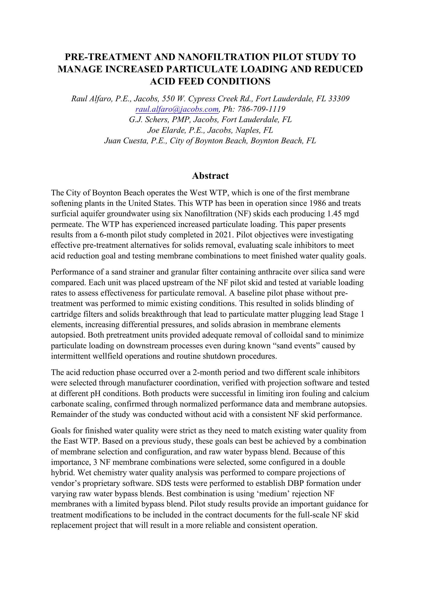 The City of Boynton Beach operates the West WTP, which is one of the first membrane softening plants in the United States. This WTP has been in operation since 1986 and treats surficial aquifer groundwater using six Nanofiltration (NF) skids each producing 1.45 mgd permeate. The WTP has experienced increased particulate loading. This paper presents results from a 6-month pilot study completed in 2021. Pilot objectives were investigating effective pre-treatment alternatives for solids removal, evaluating scale inhibitors to meet acid reduction goal and testing membrane combinations to meet finished water quality goals. Performance of a sand strainer and granular filter containing anthracite over silica sand were compared. Each unit was placed upstream of the NF pilot skid and tested at variable loading rates to assess effectiveness for particulate removal. A baseline pilot phase without pre-treatment was performed to mimic existing conditions. This resulted in solids blinding of cartridge filters and solids breakthrough that lead to particulate matter plugging lead Stage 1 elements, increasing differential pressures, and solids abrasion in membrane elements autopsied. Both pretreatment units provided adequate removal of colloidal sand to minimize particulate loading on downstream processes even during known ìsand eventsî caused by intermittent wellfield operations and routine shutdown procedures. The acid reduction phase occurred over a 2-month period and two different scale inhibitors were selected through manufacturer coordination, verified with projection software and tested at different pH conditions. Both products were successful in limiting iron fouling and calcium carbonate scaling, confirmed through normalized performance data and membrane autopsies. Remainder of the study was conducted without acid with a consistent NF skid performance. Goals for finished water quality were strict as they need to match existing water quality from the East WTP. Based on a previous study, these goals can best be achieved by a combination of membrane selection and configuration, and raw water bypass blend. Because of this importance, 3 NF membrane combinations were selected, some configured in a double hybrid. Wet chemistry water quality analysis was performed to compare projections of vendorís proprietary software. SDS tests were performed to establish DBP formation under varying raw water bypass blends. Best combination is using ëmediumí rejection NF membranes with a limited bypass blend. Pilot study results provide an important guidance for treatment modifications to be included in the contract documents for the full-scale NF skid replacement project that will result in a more reliable and consistent operation.