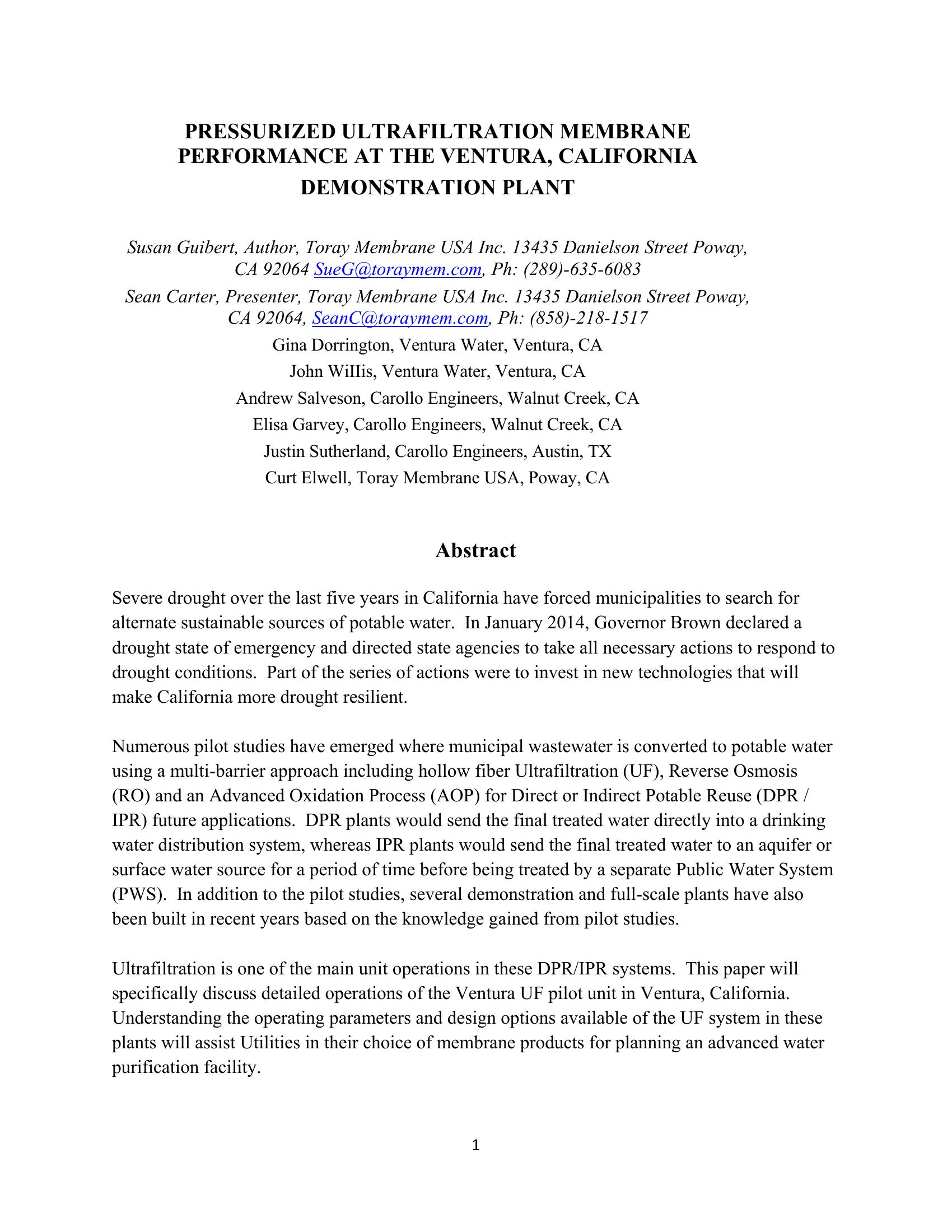 Severe drought over the last five years in California have forced municipalities to search for alternate sustainable sources of potable water. In January 2014, Governor Brown declared a drought state of emergency and directed state agencies to take all necessary actions to respond to drought conditions. Part of the series of actions were to invest in new technologies that will make California more drought resilient. Numerous pilot studies have emerged where municipal wastewater is converted to potable water using a multi-barrier approach including hollow fiber Ultrafiltration (UF), Reverse Osmosis (RO) and an Advanced Oxidation Process (AOP) for Direct or Indirect Potable Reuse (DPR / IPR) future applications. DPR plants would send the final treated water directly into a drinking water distribution system, whereas IPR plants would send the final treated water to an aquifer or surface water source for a period of time before being treated by a separate Public Water System (PWS). In addition to the pilot studies, several demonstration and full-scale plants have also been built in recent years based on the knowledge gained from pilot studies. Ultrafiltration is one of the main unit operations in these DPR/IPR systems. This paper will specifically discuss detailed operations of the Ventura UF pilot unit in Ventura, California. Understanding the operating parameters and design options available of the UF system in these plants will assist Utilities in their choice of membrane products for planning an advanced water purification facility.