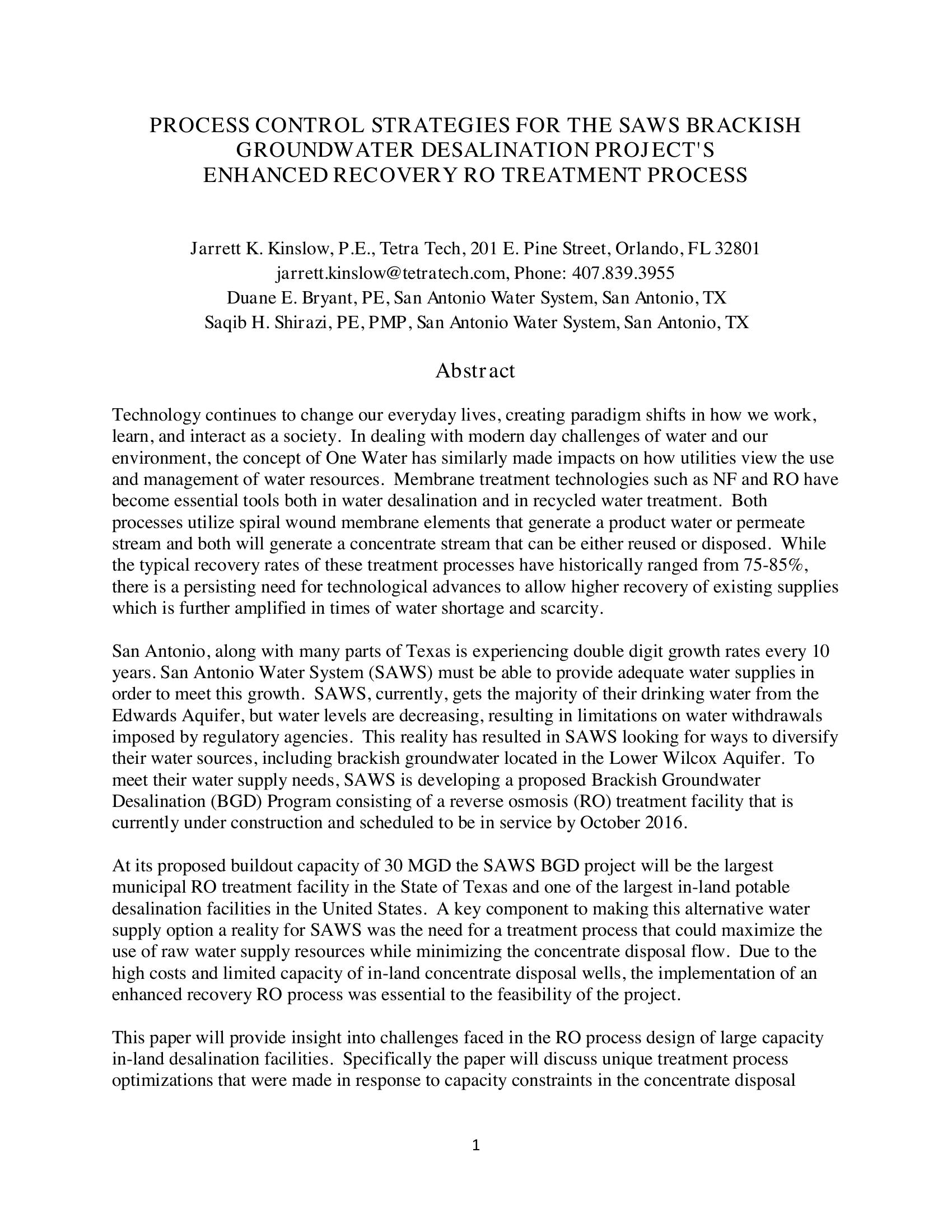 Process Control Strategies for the SAWS Brackish Groundwater Desalination Project’s Enhanced Recovery RO Treatment Process