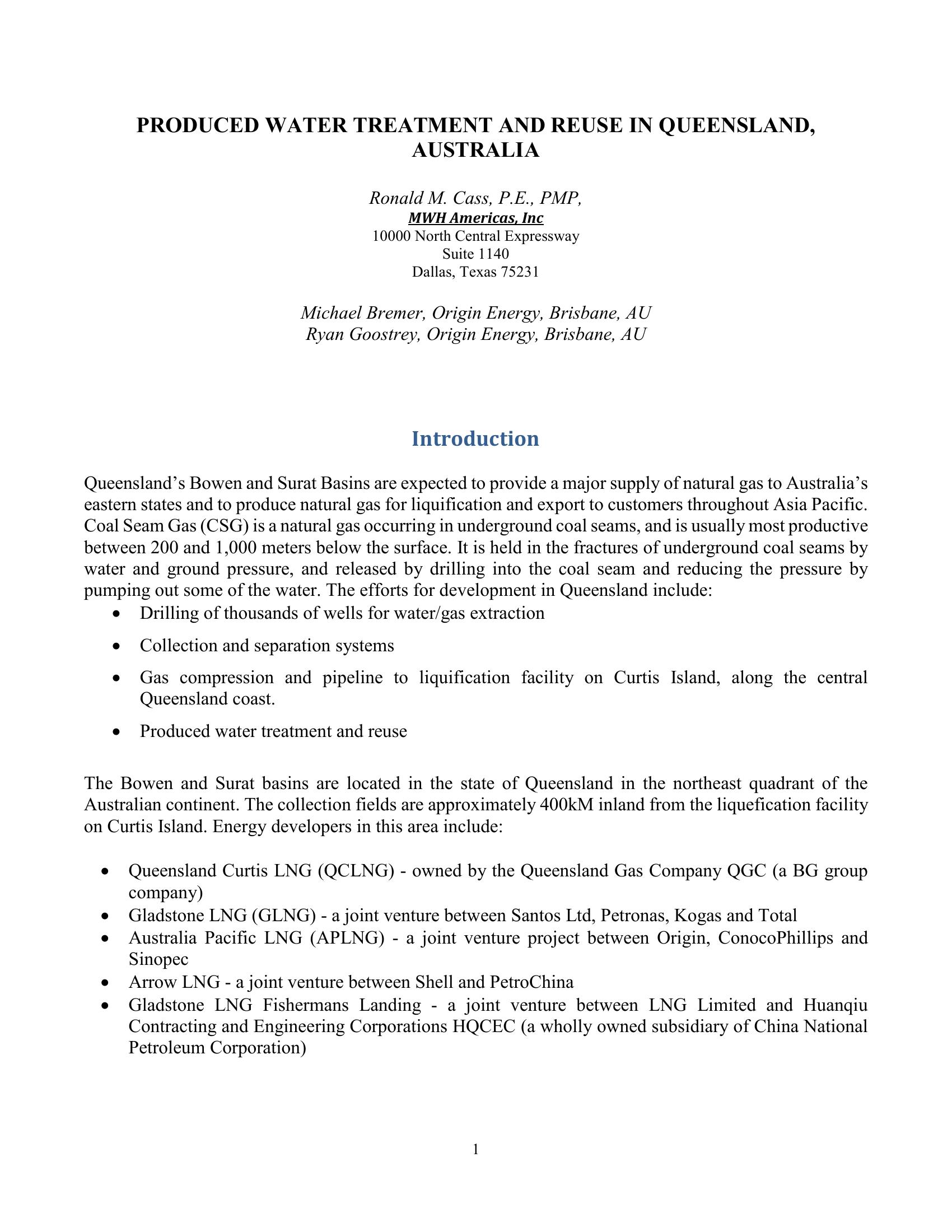 This paper discusses the options in Queensland, Australia for treatment of the produced water fraction from the gas/groundwater separation for reuse.