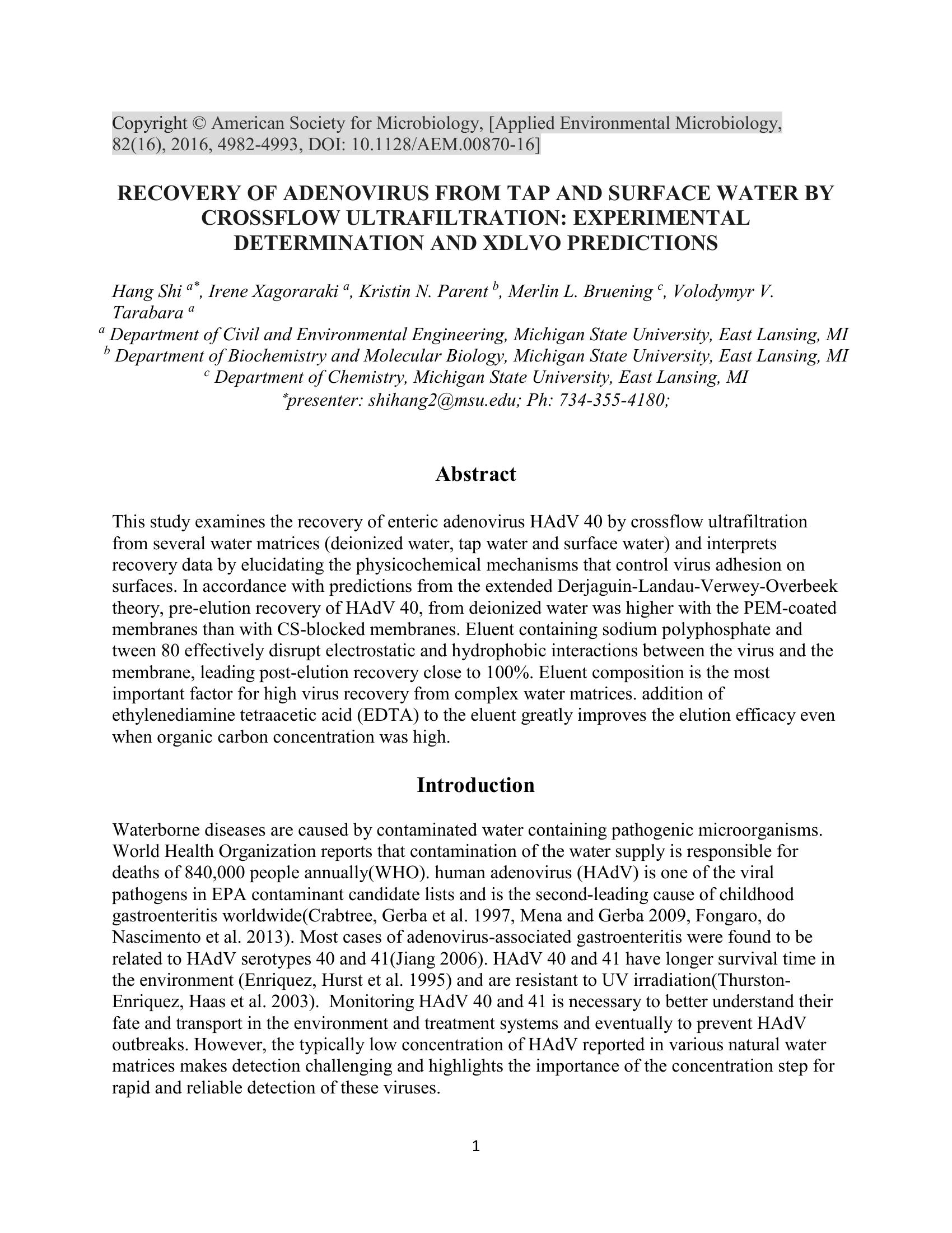 This study examines the recovery of enteric adenovirus HAdV 40 by crossflow ultrafiltration from several water matrices (deionized water, tap water and surface water) and interprets recovery data by elucidating the physicochemical mechanisms that control virus adhesion on surfaces. In accordance with predictions from the extended Derjaguin-Landau-Verwey-Overbeek theory, pre-elution recovery of HAdV 40, from deionized water was higher with the PEM-coated membranes than with CS-blocked membranes. Eluent containing sodium polyphosphate and tween 80 effectively disrupt electrostatic and hydrophobic interactions between the virus and the membrane, leading post-elution recovery close to 100%. Eluent composition is the most important factor for high virus recovery from complex water matrices. addition of ethylenediamine tetraacetic acid (EDTA) to the eluent greatly improves the elution efficacy even when organic carbon concentration was high.