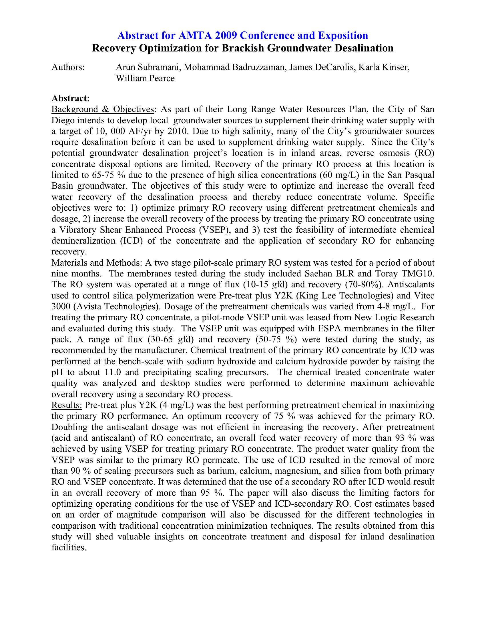 The objectives of this study were to optimize and increase the overall feed water recovery of the desalination process and thereby reduce concentrate volume.
