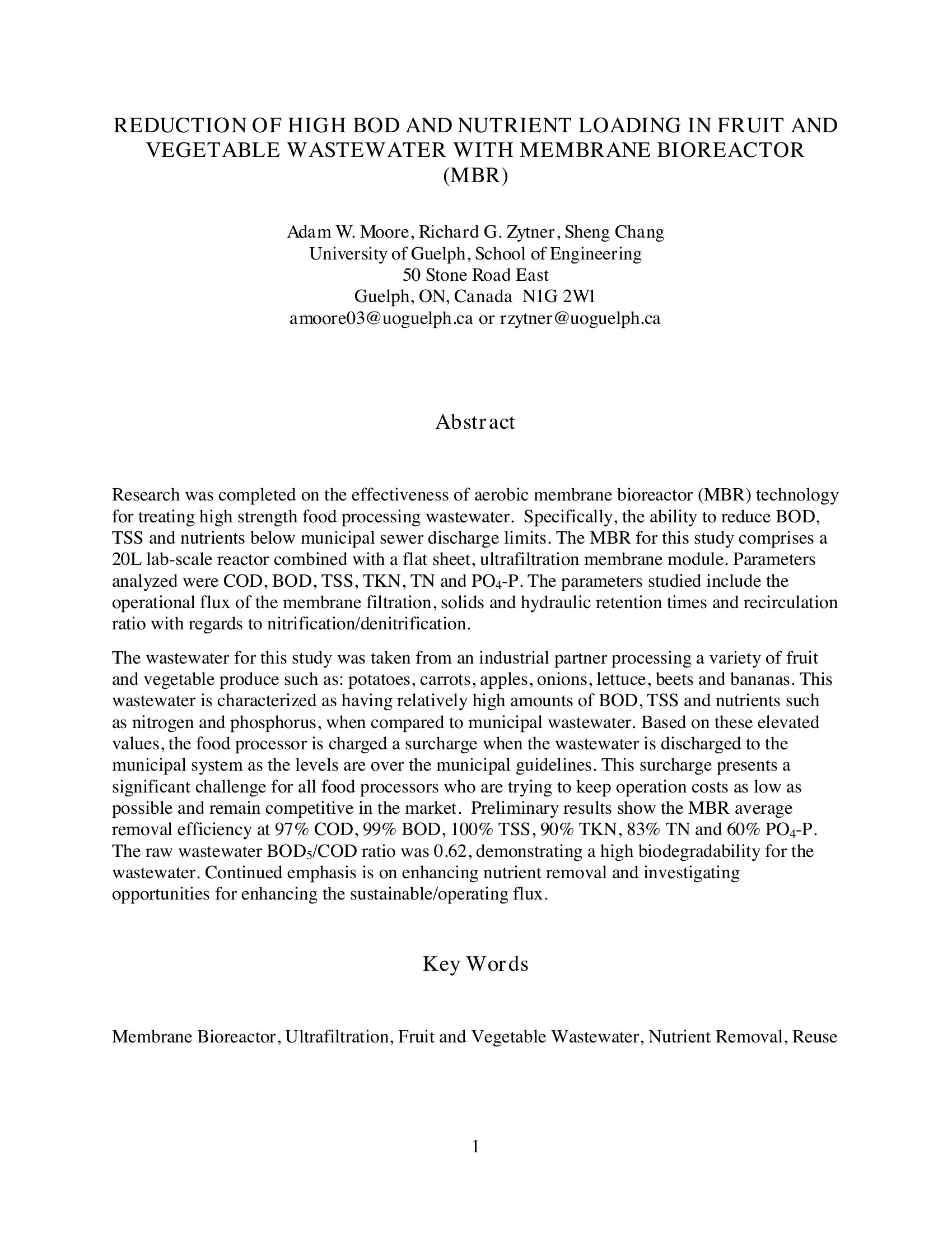 Membrane bioreactors (MBR) is used to reduce high BOD organics from industrial food waste streams for discharge to a municipal sewer system. Organic reduction is monitored using COD, BOD, TSS, TKN, TN and PO4-P. The waste was fruit and vegatables such as potatioes, carrots, apples, onions, lettuce, beets, and bananas.