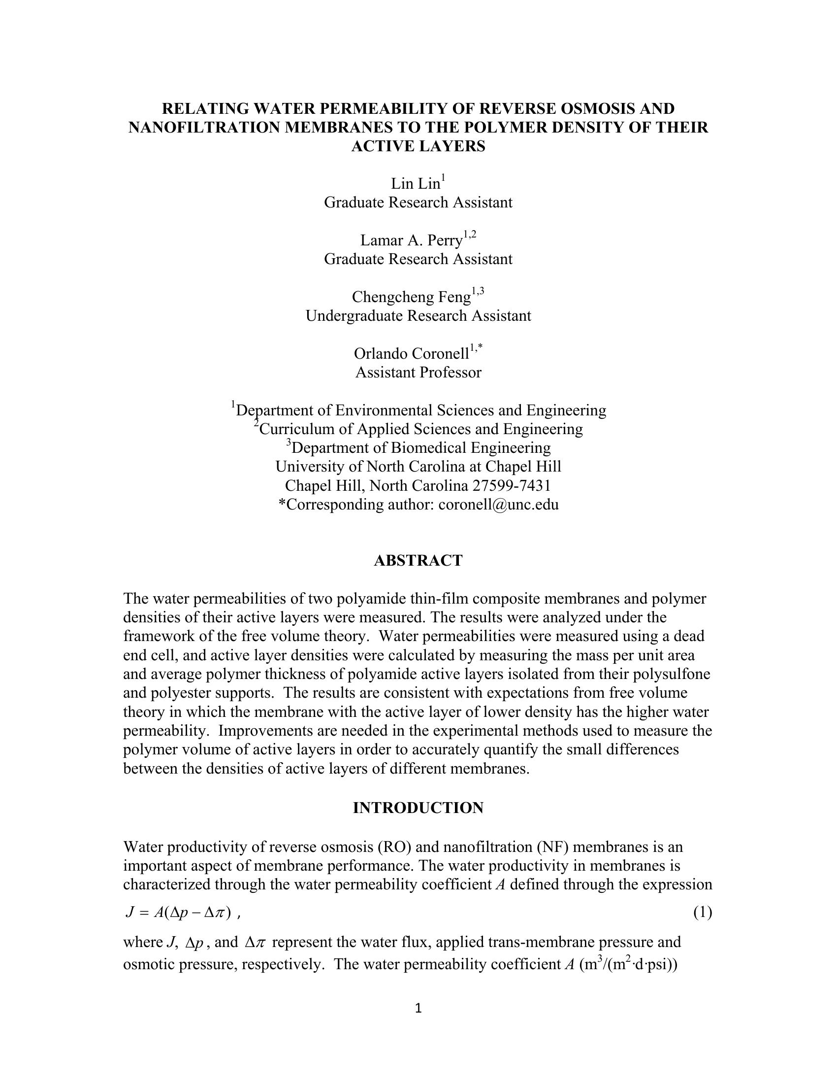 The water permeabilities of two polyamide thin-film composite membranes and polymerdensities of their active layers were measured. The results were analyzed under theframework of the free volume theory. Water permeabilities were measured using a dead end cell, and active layer densities were calculated by measuring the mass per unit area and average polymer thickness of polyamide active layers isolated from their polysulfone and polyester supports. The results are consistent with expectations from free volume theory in which the membrane with the active layer of lower density has the higher water permeability.