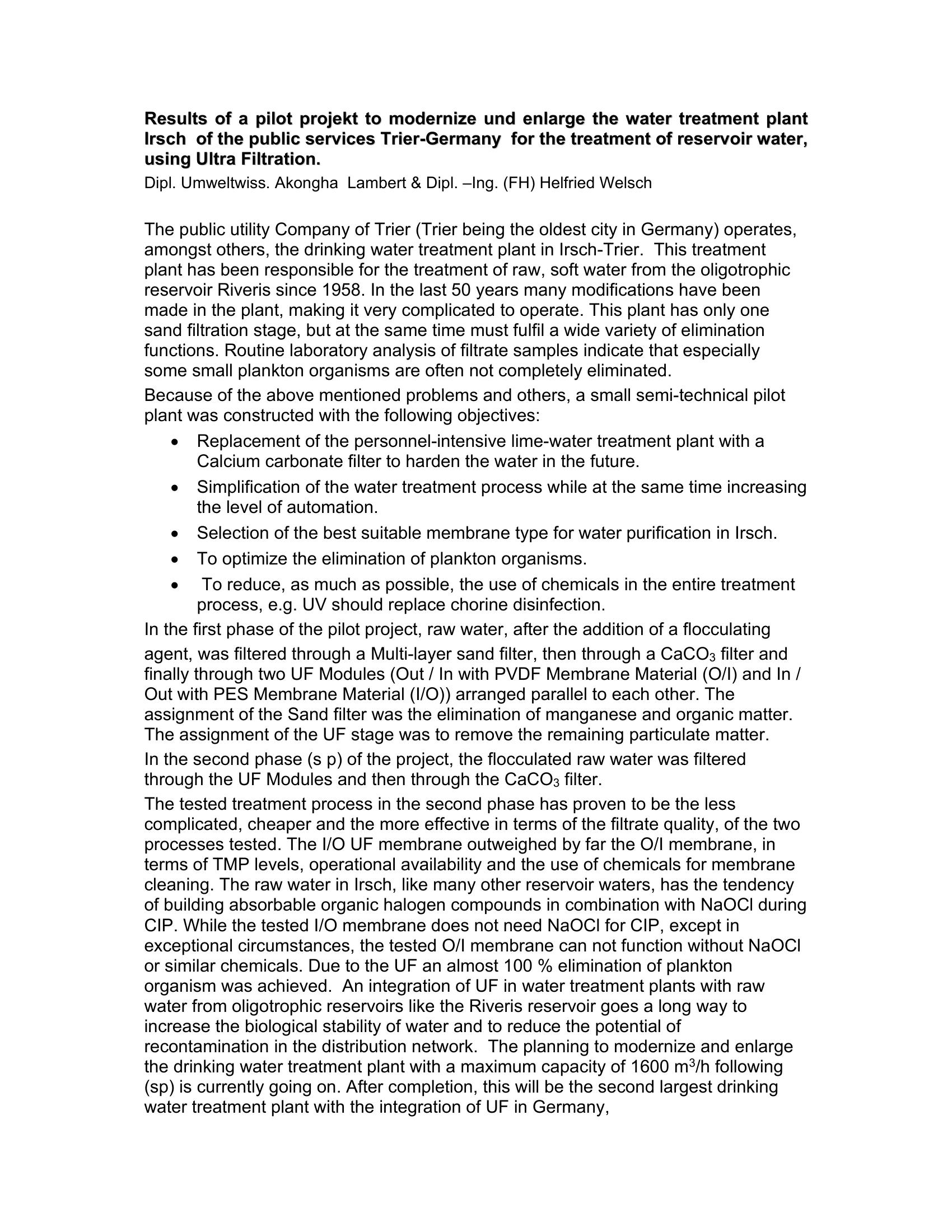 After 51 years of operation The Irsch WTP (Germany) had become complicated to operate and was not meeting filtrate requirements. Pilot testing of two UF membrane configurations was performed to determine the best option for the facility. Option 1 treatment included sand filter/calcium carbonate filter/ UF membrane. Option 2 included Coagulation/UF membrane/ Calcium carbonate filter. After testing option 2 was chosen because it was less complicated, expensive and had better filtrate quality.