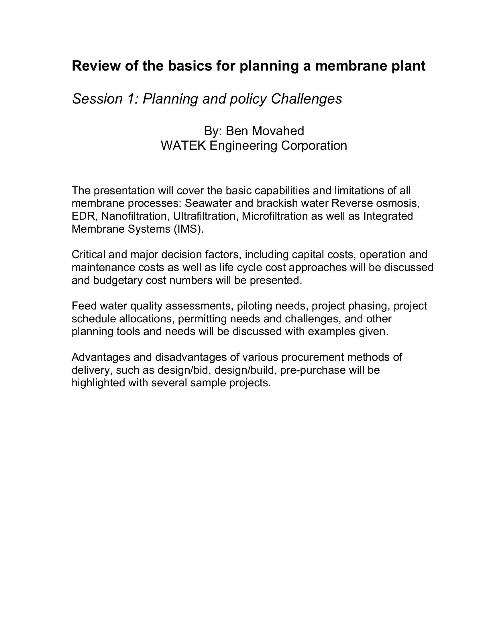 This presentation covers the basics for planning a membrane plant. The presentation covers the basic capabilities and limitations of all membrane processes: Seawater and brackish water Reverse osmosis,EDR, Nanofiltration, Ultrafiltration, Microfiltration as well as Integrated Membrane Systems (IMS). The author covers the eight phases of a membrane project, from deciding if membrane is the best solution by conducting a true comprehensive feasibility study to leaving adequate budget and incentive to complete the last 3 phases of the project (Testing, Start-up and Close out).