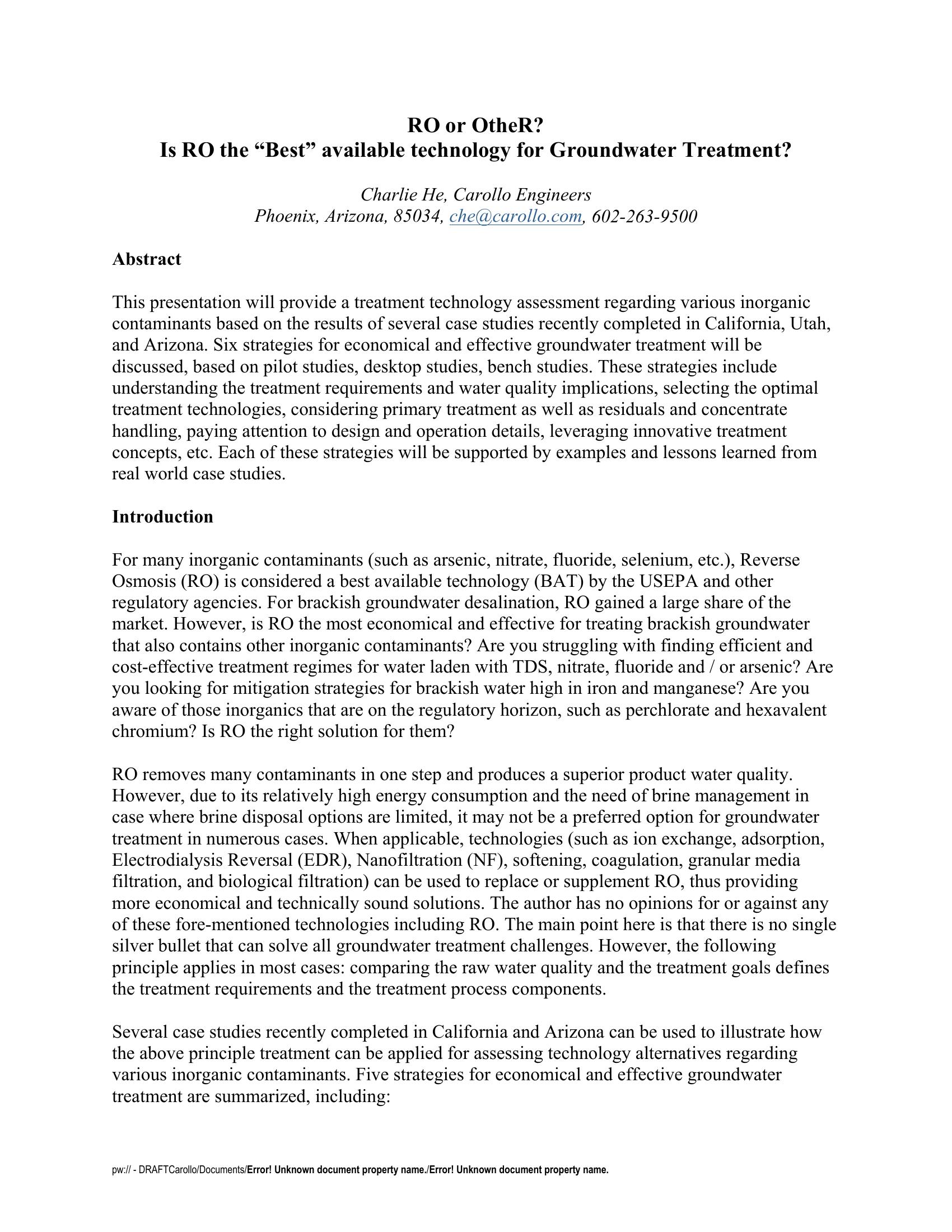 This presentation provides an assessment of treatment technologies addressing inorganic contaminants and is based on several case studies completed in California, Utah, and Arizona. Six strategies for economical and effective groundwater treatment will be discussed based on pilot, desktop, and bench studies. These strategies include understanding the treatment requirements and water quality implications, selecting the optimal treatment technologies, considering primary treatment as well as residuals and concentrate handling, design and operation details, and leveraging innovative treatment concepts. Each of these strategies is supported by examples and lessons learned from real world case studies.