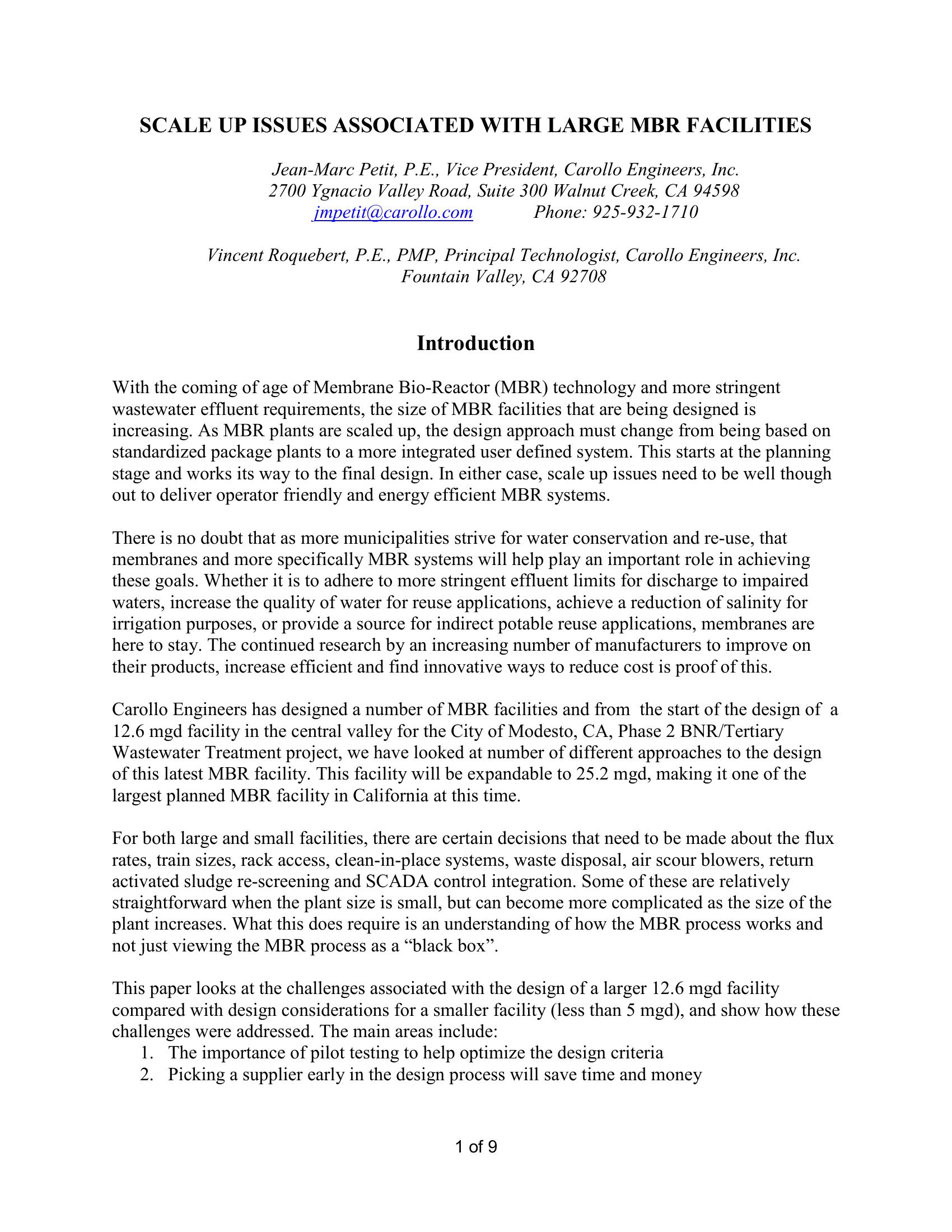 This paper looks at the challenges associated with the design of a larger 12.6 mgd facility compared with design considerations for a smaller facility (less than 5 mgd), and shows how these challenges were addressed. Discussion includes: pilot testing, supplier selection, pre-purchase process, accommodatig for future expansion, using 3D design, considering peaking factors, plant operations and maintenance, integration with exsting facilities.