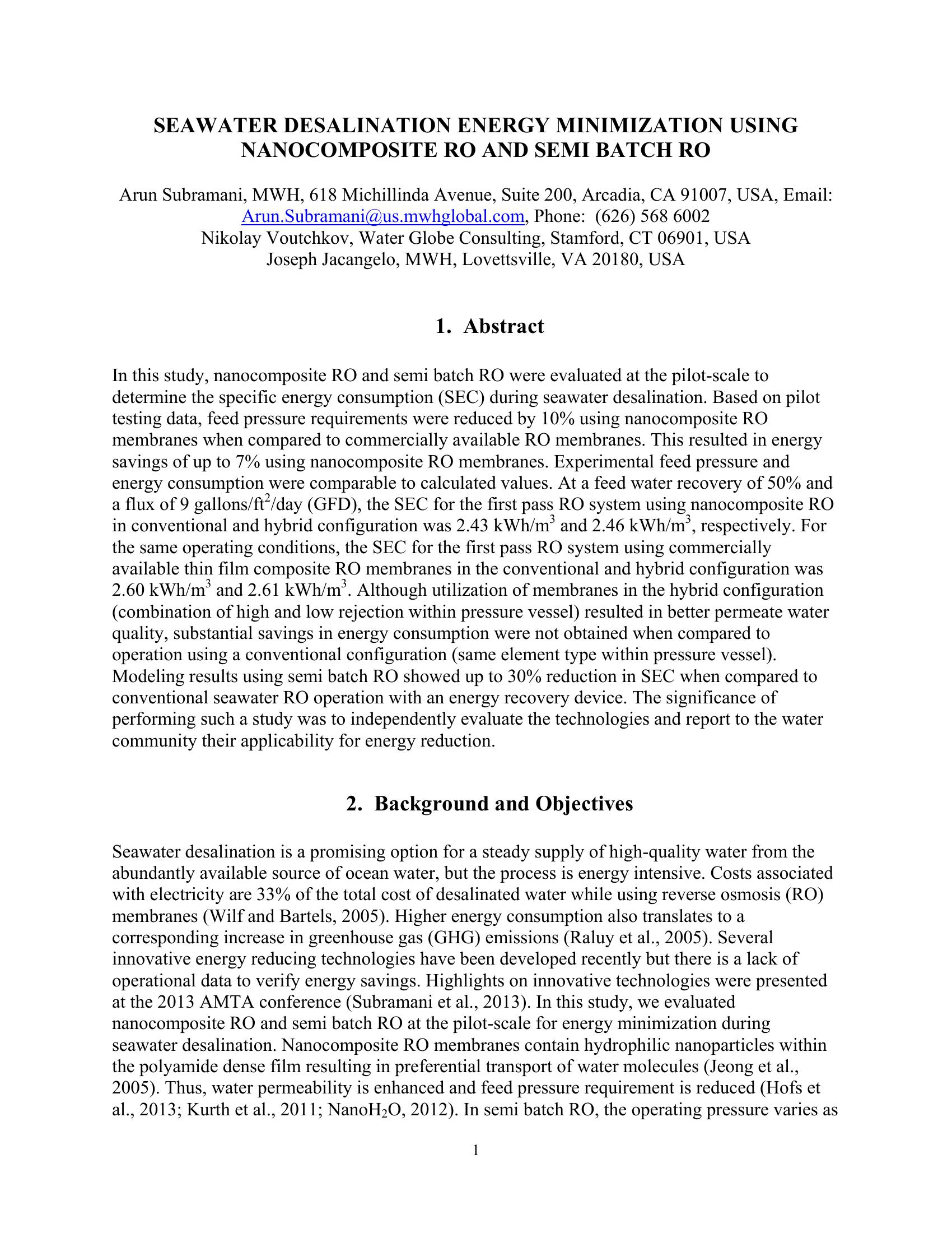 Seawater desalination is a promising option for a steady supply of high-quality water from the abundantly avialable source of ocean water, but the process is energy intensive. In this paper, nanocomposite RO and semi batch RO were evaluated at the pilot scale for energy minimzation during seawate desalination. The objecties were to: 1) compare the specific energy consumption (SEC) of these two innovative technologies with conventional RO, and 2) evaluate their performance and applicability at the full-scale. The SEC was evaluated at several operating conditions and treated water qualite was assessed and compared with conventional RO technologies employed at various full scale locations. Based on pilot testing data, feed pressure requirements were reduced by 10% using nanocomposite RO membranes when compared to commercially available RO membranes and it resulted in energy savings of up to 7% using nanocomposite RO membranes.