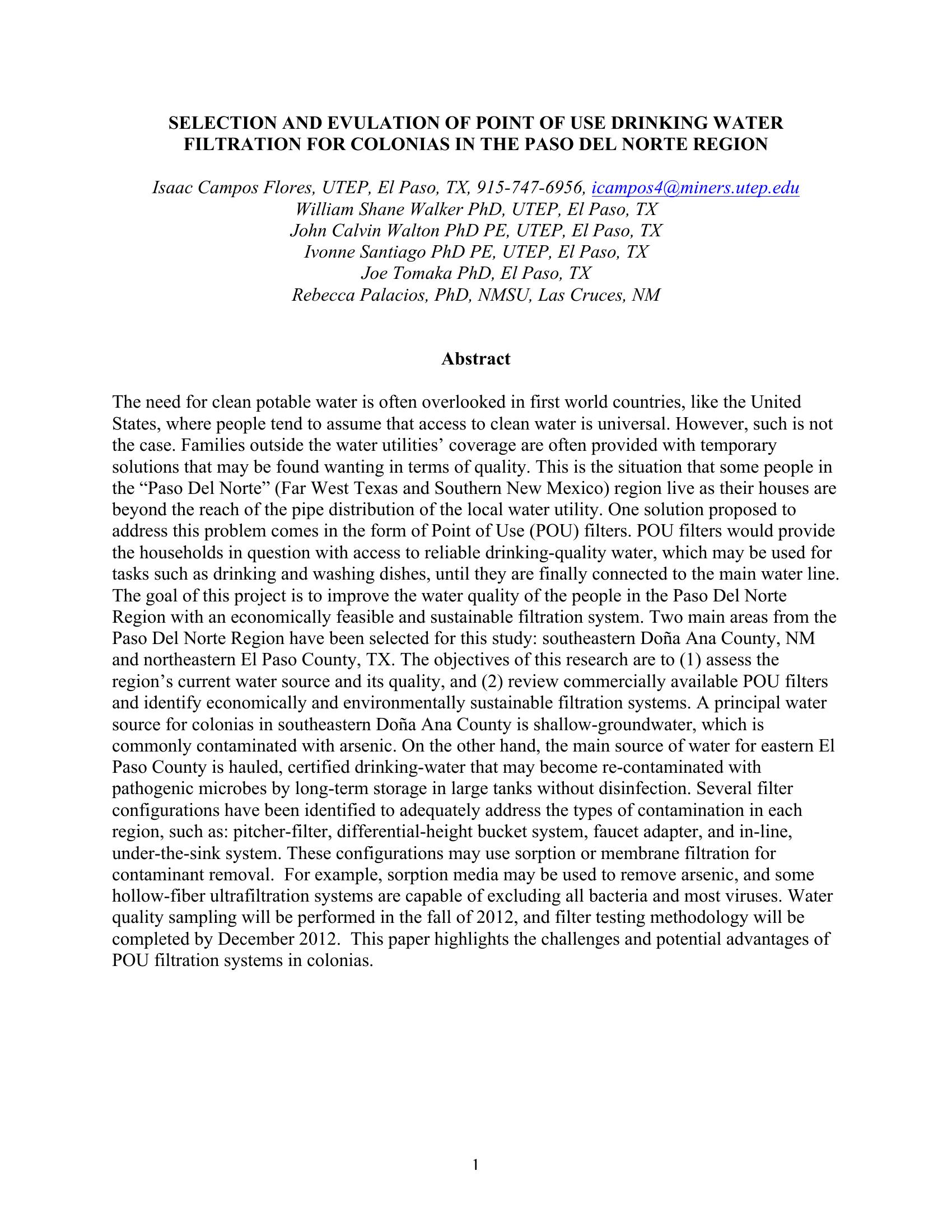Selection and Evulation of Point of use Drinking Water Filtration for Colonias in the Paso Del Norte Region
