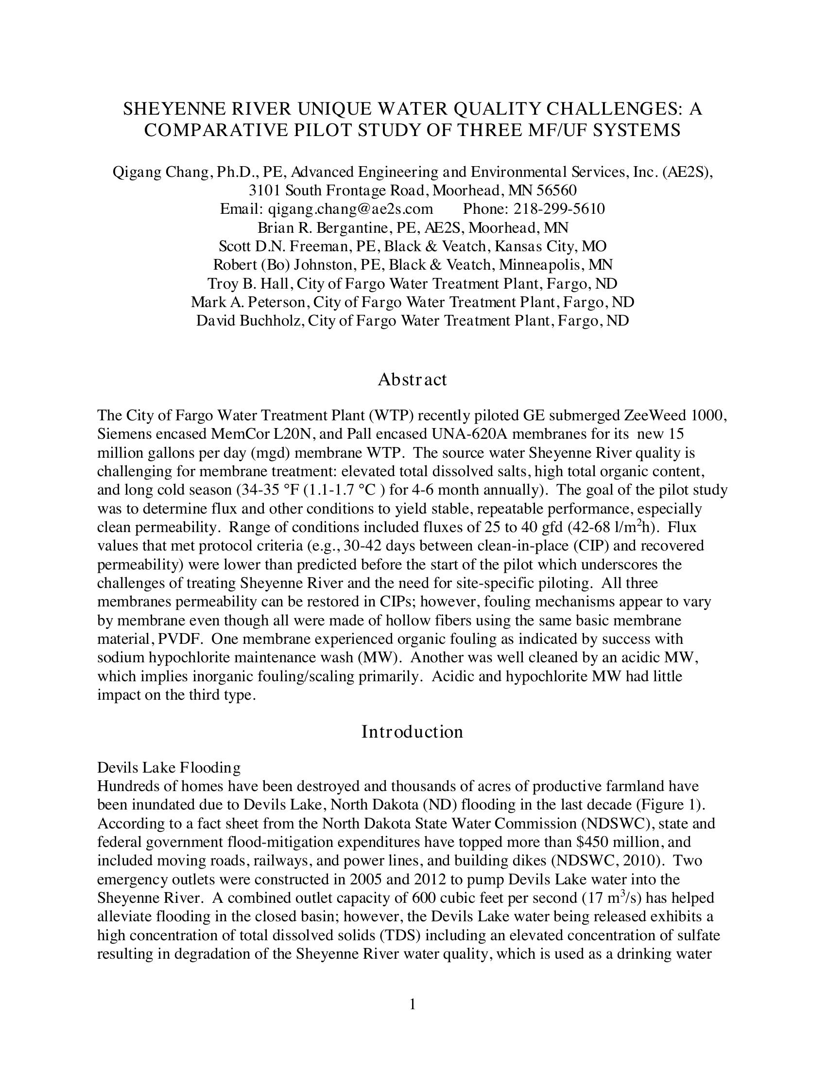The City of Fargo Water Treatment Plant (WTP) recently piloted GE submerged ZeeWeed 1000, Siemens encased MemCor L20N, and Pall encased UNA-620A membranes for its new 15 million gallons per day (mgd) membrane WTP. The source water Sheyenne River quality is challenging for membrane treatment: elevated total dissolved salts, high total organic content, and long cold season (34-35 ¯F (1.1-1.7 ¯C ) for 4-6 month annually). The goal of the pilot study was to determine flux and other conditions to yield stable, repeatable performance, especially clean permeability. Results and conclusions are discussed herein.