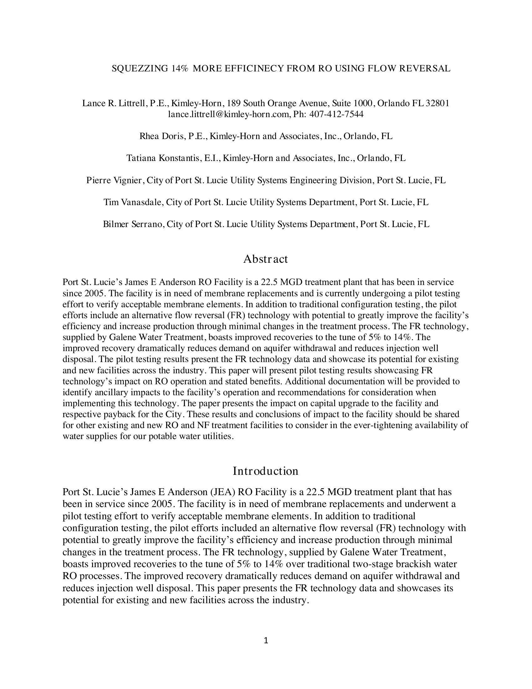 Port St. Lucieís James E Anderson RO Facility is a 22.5 MGD treatment plant that has been in service since 2005. The facility is in need of membrane replacements and is currently undergoing a pilot testing effort to verify acceptable membrane elements. In addition to traditional configuration testing, the pilot efforts include an alternative flow reversal (FR) technology with potential to greatly improve the facilityís efficiency and increase production through minimal changes in the treatment process. The FR technology, supplied by Galene Water Treatment, boasts improved recoveries to the tune of 5% to 14%. The improved recovery dramatically reduces demand on aquifer withdrawal and reduces injection well disposal. The pilot testing results present the FR technology data and showcase its potential for existing and new facilities across the industry. This paper will present pilot testing results showcasing FR technologyís impact on RO operation and stated benefits. Additional documentation will be provided to identify ancillary impacts to the facilityís operation and recommendations for consideration when implementing this technology. The paper presents the impact on capital upgrade to the facility and respective payback for the City. These results and conclusions of impact to the facility should be shared for other existing and new RO and NF treatment facilities to consider in the ever-tightening availability of water supplies for our potable water utilities.