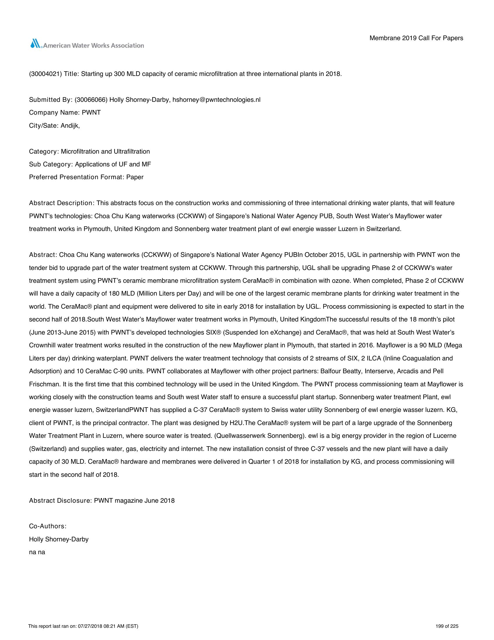 This abstracts focus on the construction works and commissioning of three international drinking water plants, that will feature PWNT?s technologies: Choa Chu Kang waterworks (CCKWW) of Singapore?s National Water Agency PUB, South West Water?s Mayflower water treatment works in Plymouth, United Kingdom and Sonnenberg water treatment plant of ewl energie wasser Luzern in Switzerland.