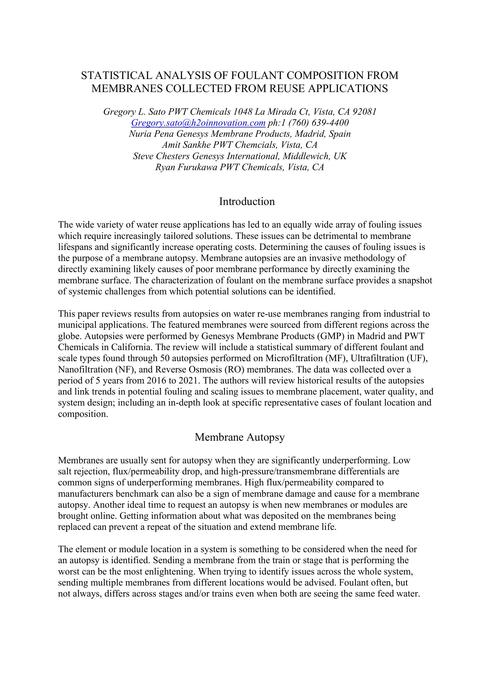 Statistical Analysis of Foulant Composition from Membranes Collected from Reuse Applications