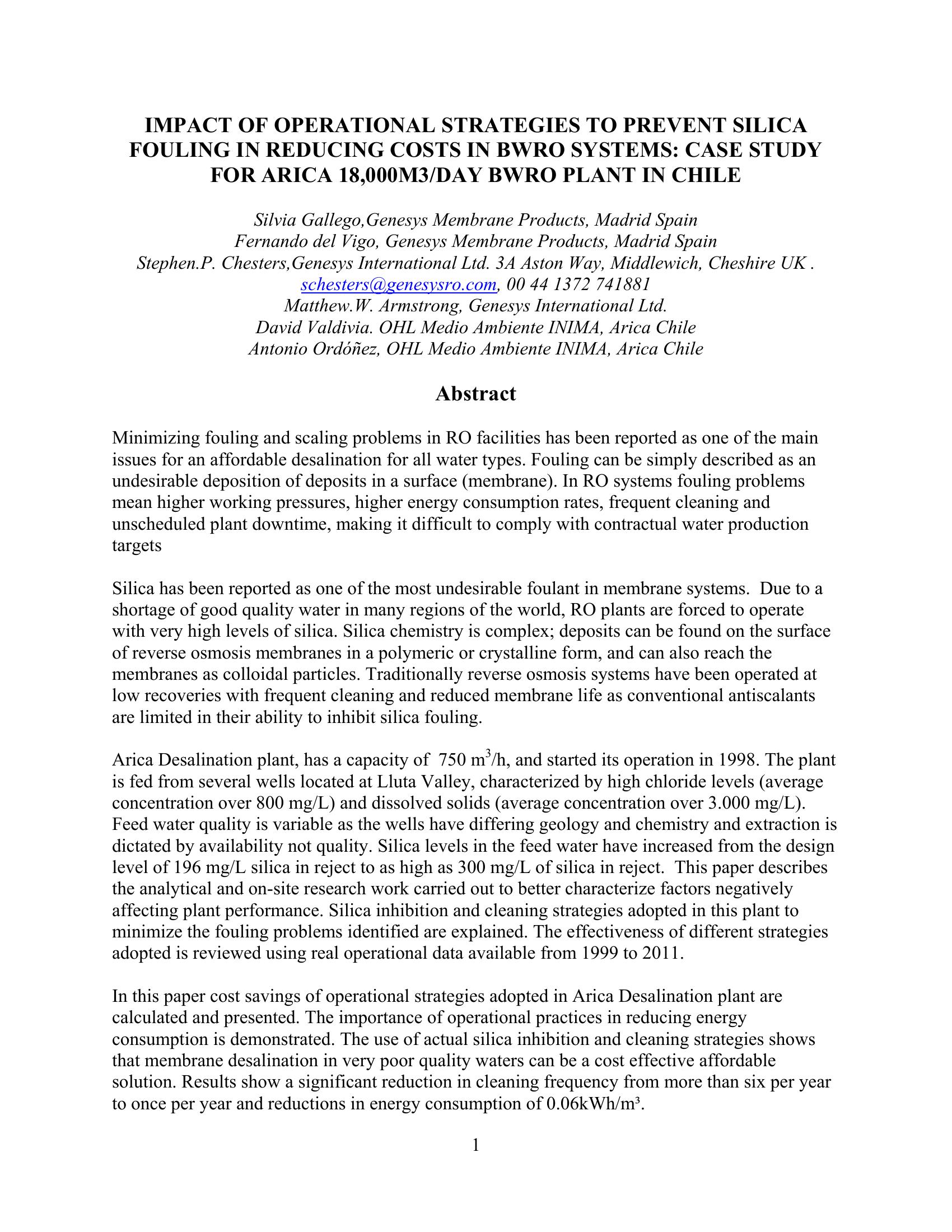 IMPACT OF OPERATIONAL STRATEGIES TO PREVENT SILICA FOULING IN REDUCING COSTS IN BWRO SYSTEMS: CASE STUDY FOR ARICA 18,000M3/DAY BWRO PLANT IN CHILE.In this paper cost savings of operational strategies adopted in Arica Desalination plant are calculated and presented. The importance of operational practices in reducing energy consumption is demonstrated. The use of actual silica inhibition and cleaning strategies shows that membrane desalination in very poor quality waters can be a cost effective affordable solution. Results show a significant reduction in cleaning frequency from more than six per year to once per year and reductions in energy consumption of 0.06kWh/m?.