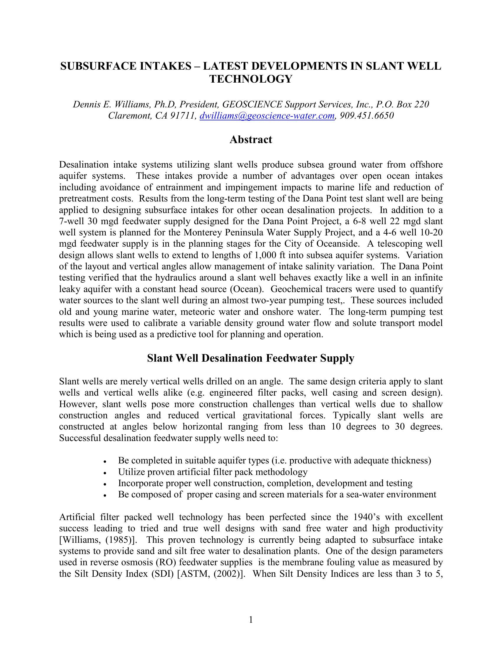 Slant wells are a method to supply raw water for a seawater desalting plant. A slant well is a water supply well drilled on an angle instead of vertically and eliminates impacts to sea life, water quality upsets due to storm activity, and reduces pretreatment costs. Test pumping from the test wells at the Dana Point, California facility provides data to support the benefits of this seawater supply configuration.