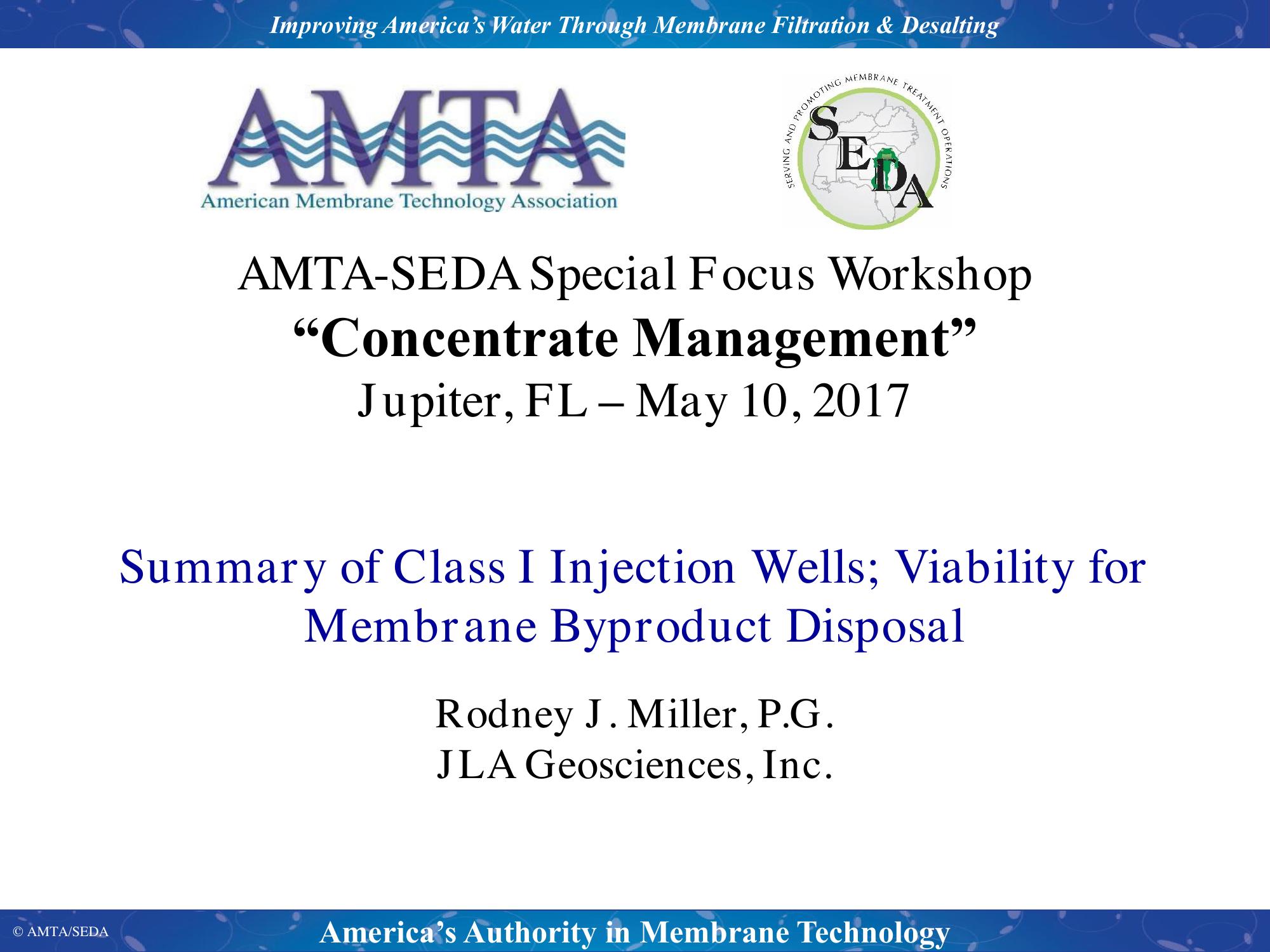 Summary of Class I InjectionWells; Viability for Membrane Byproduct Disposal