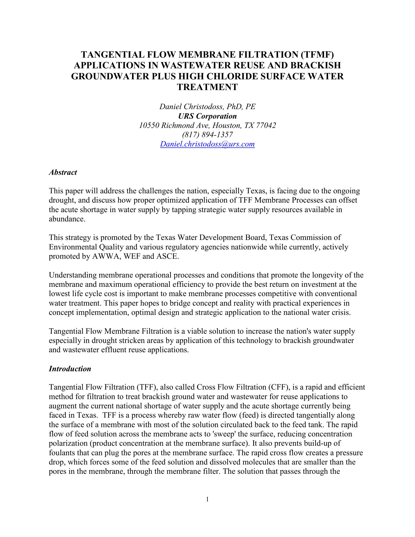 Tangential Flow Membrane Filtration (TFMF) Applications in Wastewater Reuse and Brackish Groundwater Plus High Chloride Surface Water Treatment