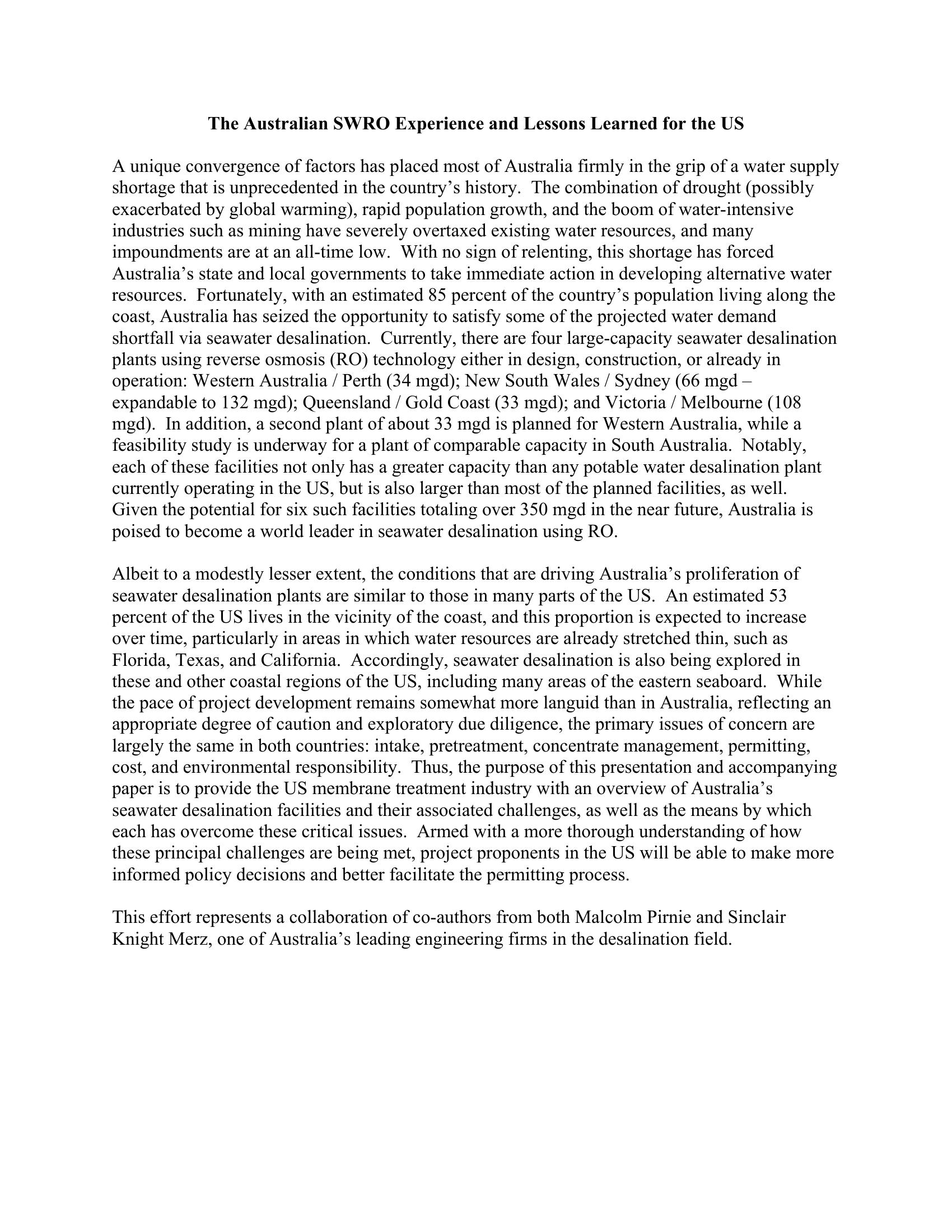 | Keywords | Sea Water Desalination, Australia, Lessons Learned |