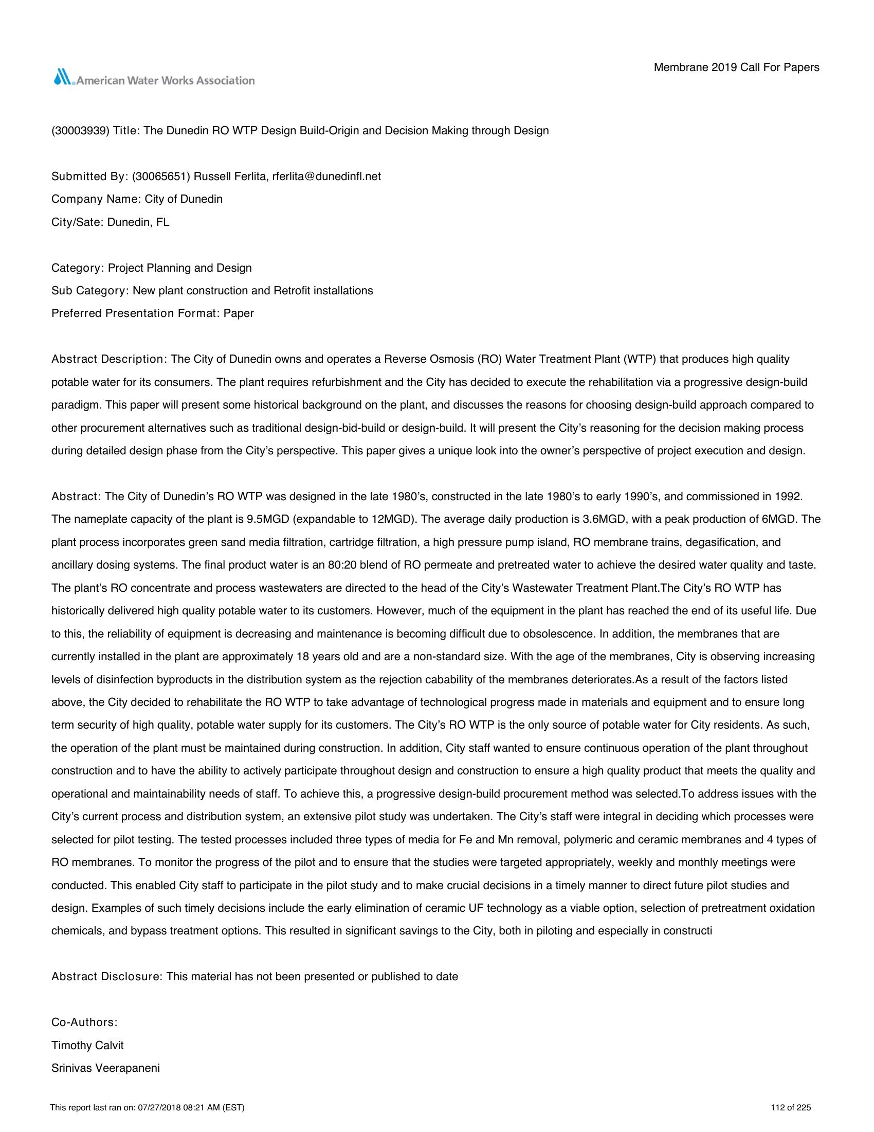 The City of Dunedin owns and operates a Reverse Osmosis (RO) Water Treatment Plant (WTP) that produces high quality potable water for its consumers. The plant requires refurbishment and the City has decided to execute the rehabilitation via a progressive design-build paradigm. This paper will present some historical background on the plant, and discusses the reasons for choosing design-build approach compared to other procurement alternatives such as traditional design-bid-build or design-build. It will present the City?s reasoning for the decision making process during detailed design phase from the City?s perspective. This paper gives a unique look into the owner?s perspective of project execution and design.